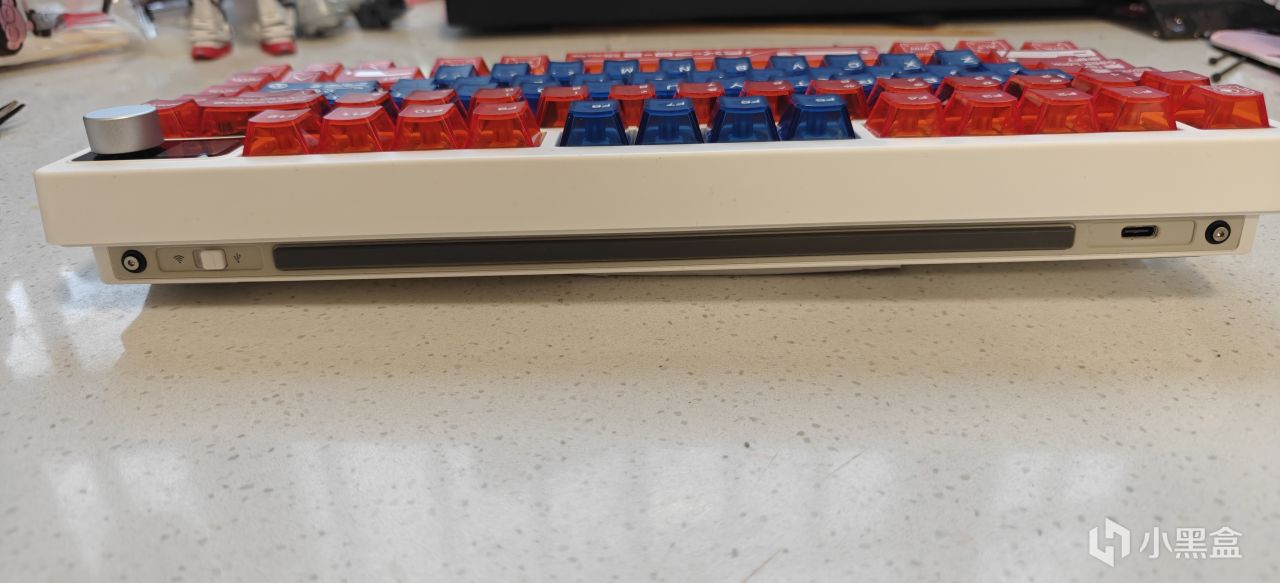 正面看完,咱们来看一看侧面。首先是上侧面,提供了接口和开关。侧面采用的是层叠设计,看起来不会太过突兀。两颗螺丝一左一右对称式的分布两边,最左边的是TypeC接口,右边则是三模切换拨片。键盘支持三模连接,2.4G、蓝牙和有线连接轻松拨动就可以调节连接方式。开关和接口甚至都有专属的凹槽,对应的凸出自然就是侧面的一长条了。