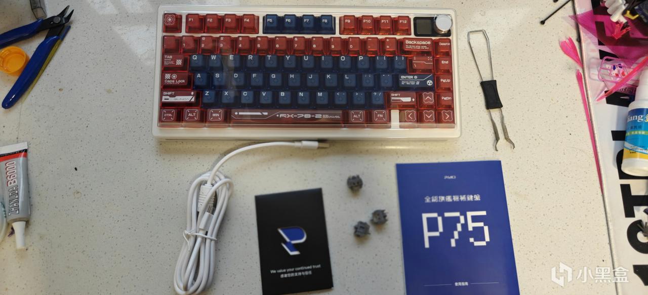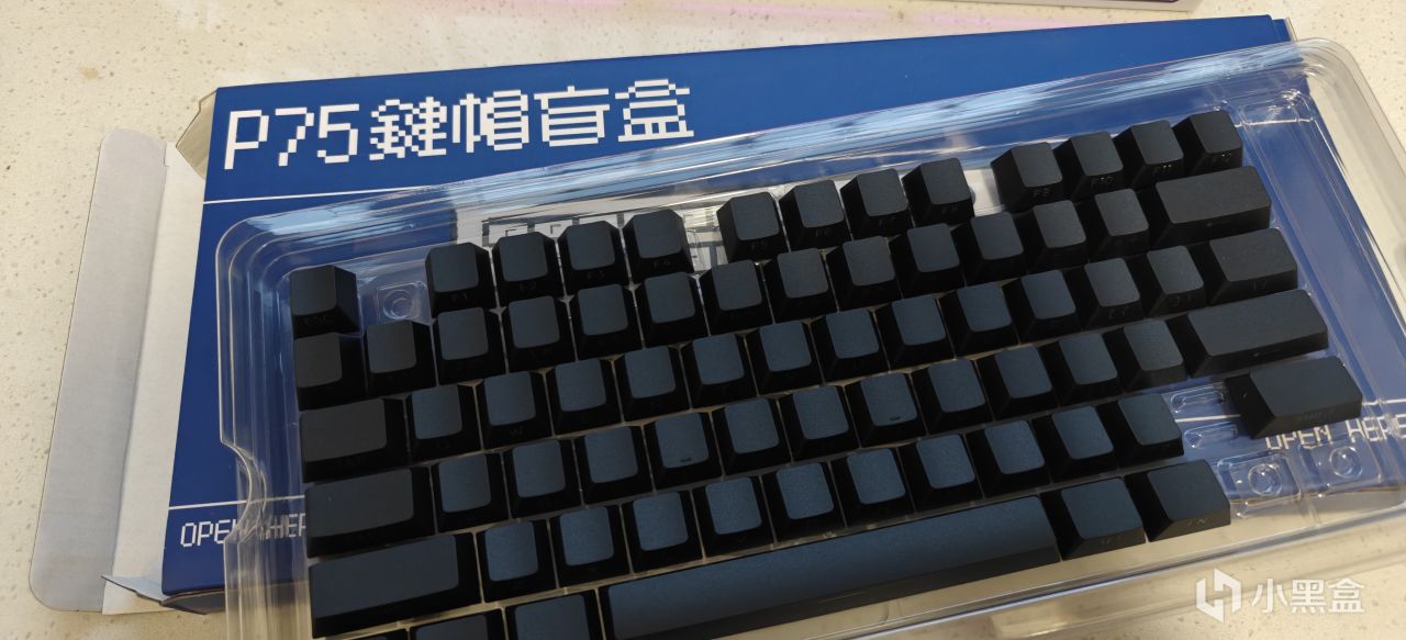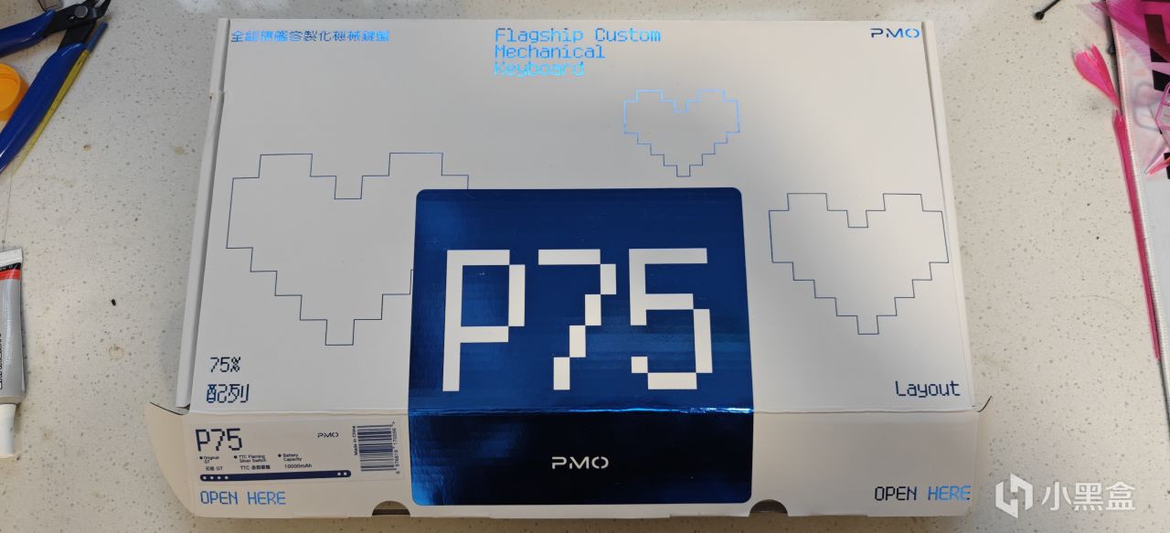 铺垫了这么多,咱们还是来看看键盘吧。甚至还有专门的运输盒,打开包装是纯白的飞机盒。正面十分的简洁和清新,这次应该主打的是像素设计风格。因为外盒是以白色作为底色,蓝色图案和文字进行点缀。而文字都是像素字体,甚至还有像素风格线条勾勒出的爱心。中间是一大块蓝色,镂空了“P75”的型号名。