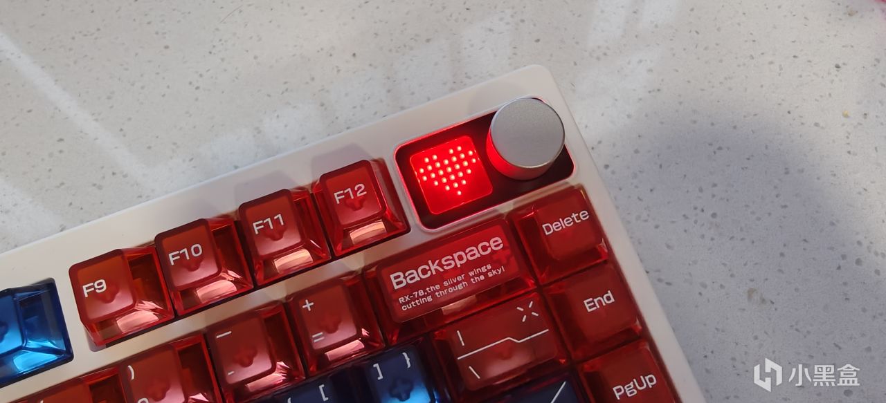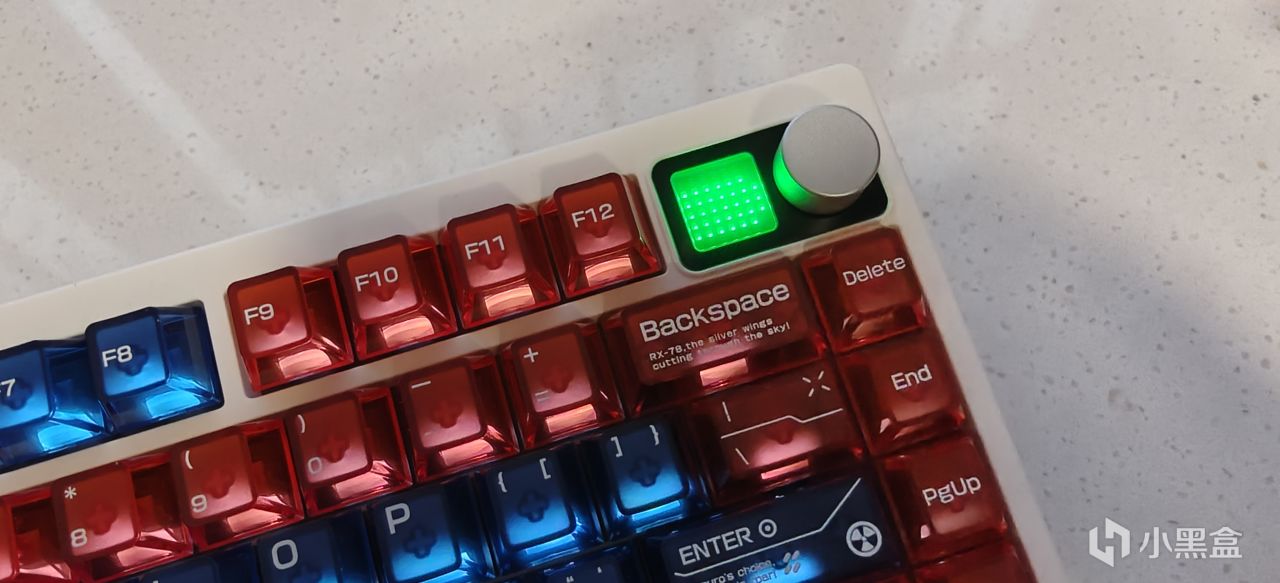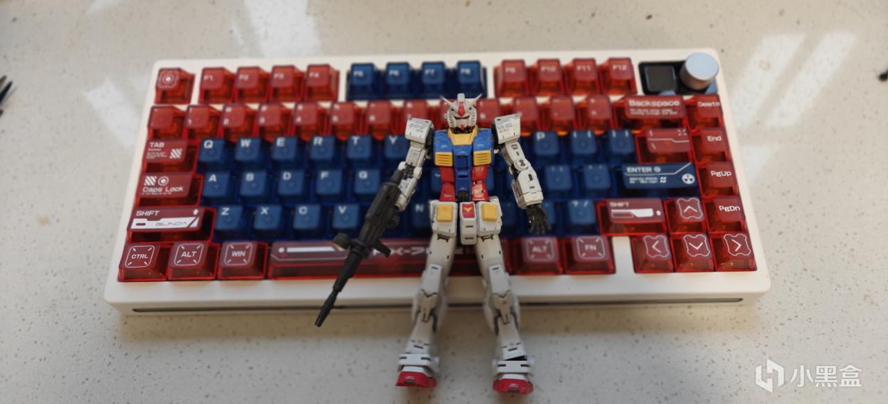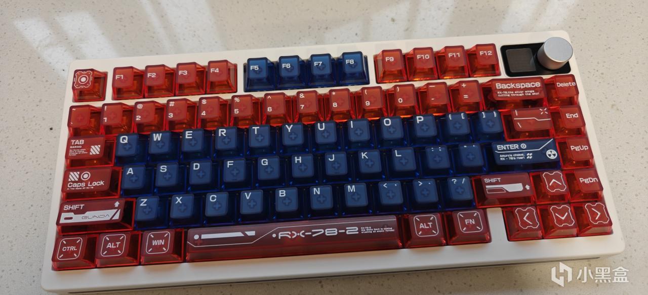 这次的键盘外壳是冷白色设计,自然白色就成了主题。而键帽的颜色趋势则是一团红色把蓝色包裹了起来,官方将其命名为“元祖GT”自然也就颇为合理了。万代的元祖也是白色为主体,然后是红色蓝色进行点缀。两者唯一不同的就是元祖高达还有黄色的围脖、胸前的出气栅栏和胯部的侧裙甲。不过都是无伤大雅,毕竟在一定程度上也算得上反万代设计。何况光是红蓝撞色氛围,再加上键帽彩透设计,两者结合起来键盘的颜值就已经更高了。而且在功能键上也都有一些设计元素包含在内,还是很不错的。