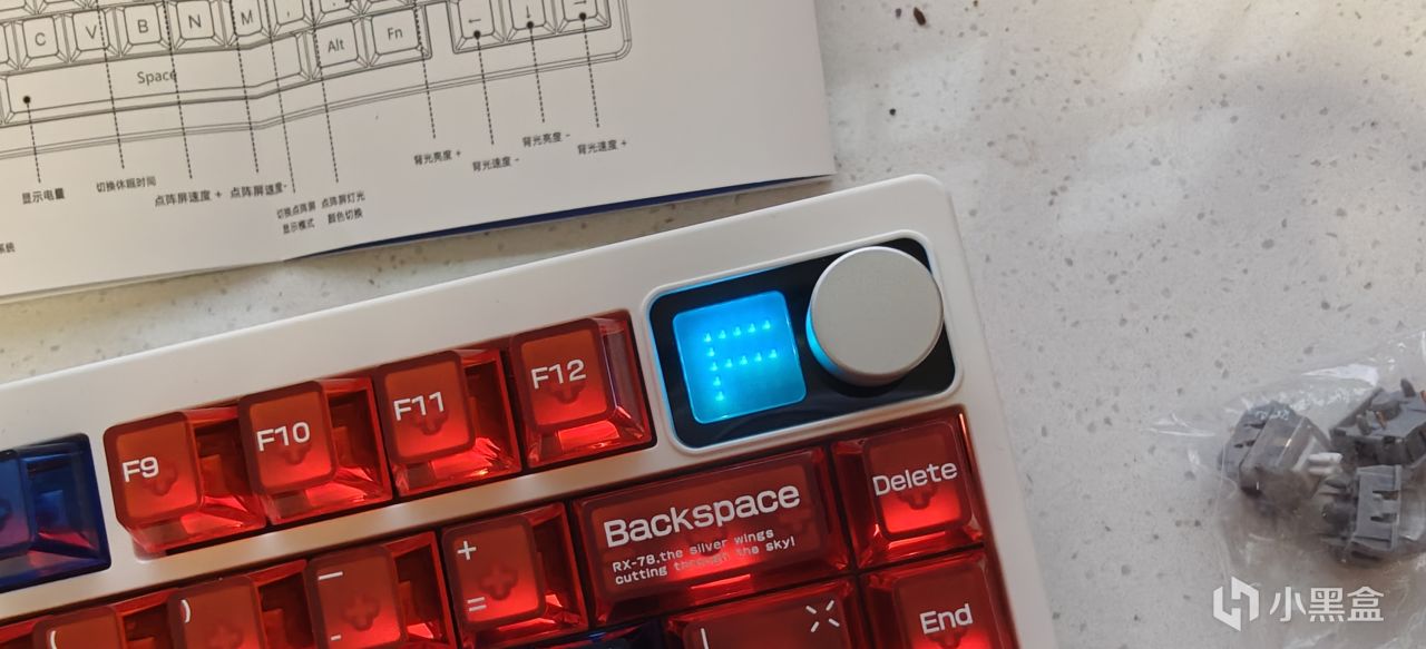 首先来看看这次的重点键盘本体吧,拿到手里就感觉份量很足。一眼望去键盘按键组合的十分的紧凑,空间利用的十分的充足。上面是经典的窄额头,而最吸引眼球的就是右上侧的金属旋钮和点阵屏。点亮键盘之后,点阵屏会呈现不同的像素点阵组成的图案。十分的亮眼,也正好对应了外包装的设计风格。通过快捷键输入我们可以用点阵屏查看电量,还可以修改显示模式和亮度切换等。