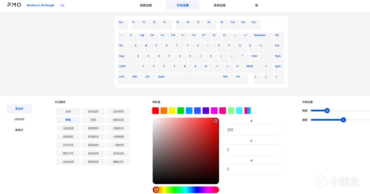 下侧面则是RGB表现的另外一大场景,因为下侧面有一个长条灯带。而且为了美观还被均匀的分成了三份的存在,灯带的边缘也进行了加黑处理防止额外的透光。通电开启后下方的RGB效果十分的不错,同时还可以搭配键盘正面键帽的灯光效果一起进行同步。更协调,能美观。