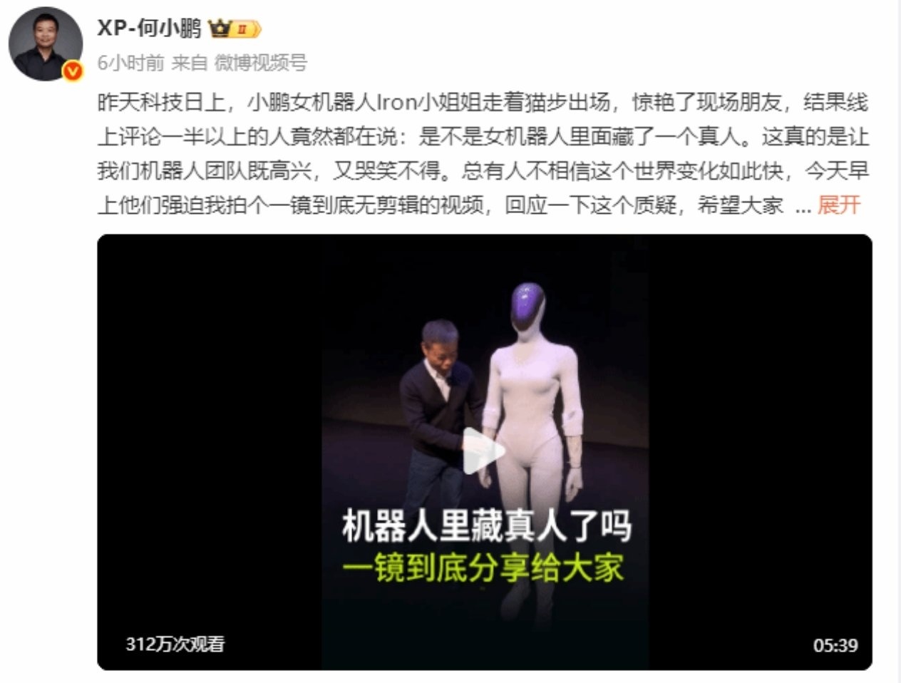此前一天,小鹏在科技日活动中展示了全新一代IRON机器人,其高度拟人的步态引发网络热议,不少网友怀疑是“真人扮演”。何小鹏表示,小鹏目标在2026年底实现高阶人形机器人规模量产。