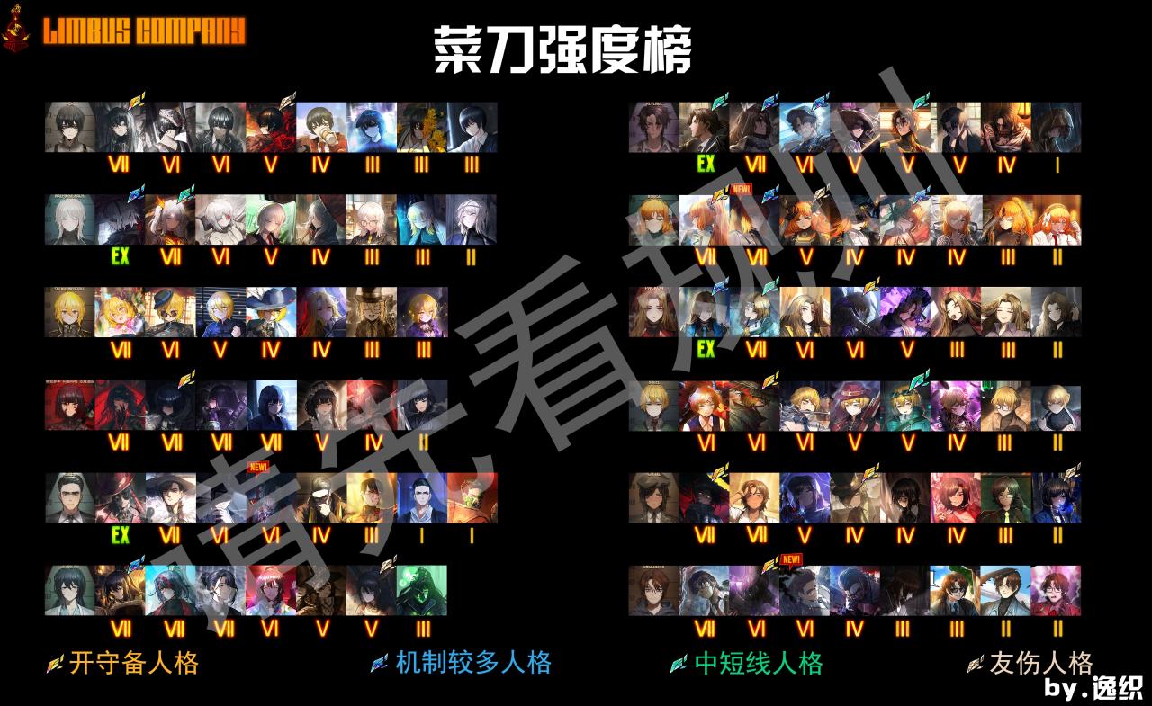 榜单为计分制菜刀榜,以牢外单槽对单六回合循环点数伤害为主,十二回合循环为次计分,不考虑体系、特定队友与ego辅助,点数伤害计算攻防等级,考虑牌序与理智,点数过低扣分,肉度与泛用辅助加分,流血沉沦破裂默认叠不到下回合,烧伤震颤层数消耗仅计算自身触发的,不进行可能造成友伤的循环,所有对群,广域乱射,可拼点反击技能按照一般对单技能计算,队友默认每回合提供每种罪孽资源各1个,仅给需要罪孽共鸣的人格提供2共鸣,给需要debuff增伤的人格2种debuff,人格强度仅体现在此规则下,不具备任何参考意义。