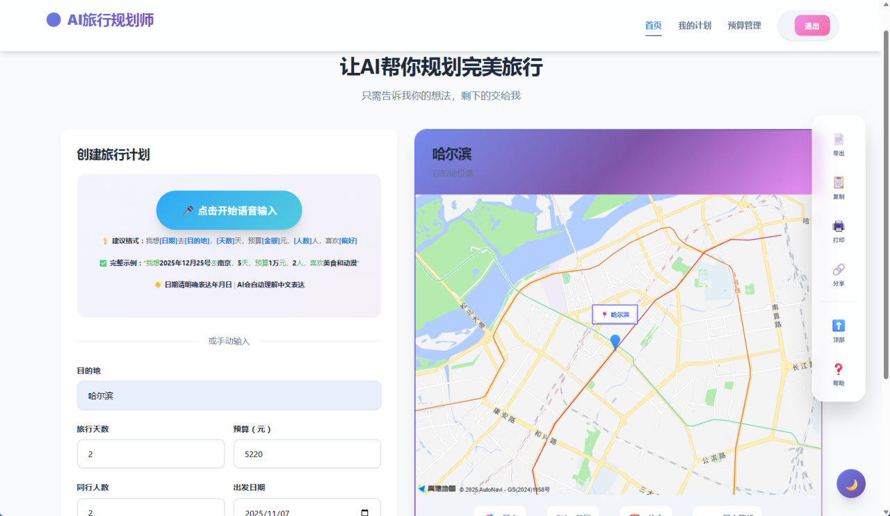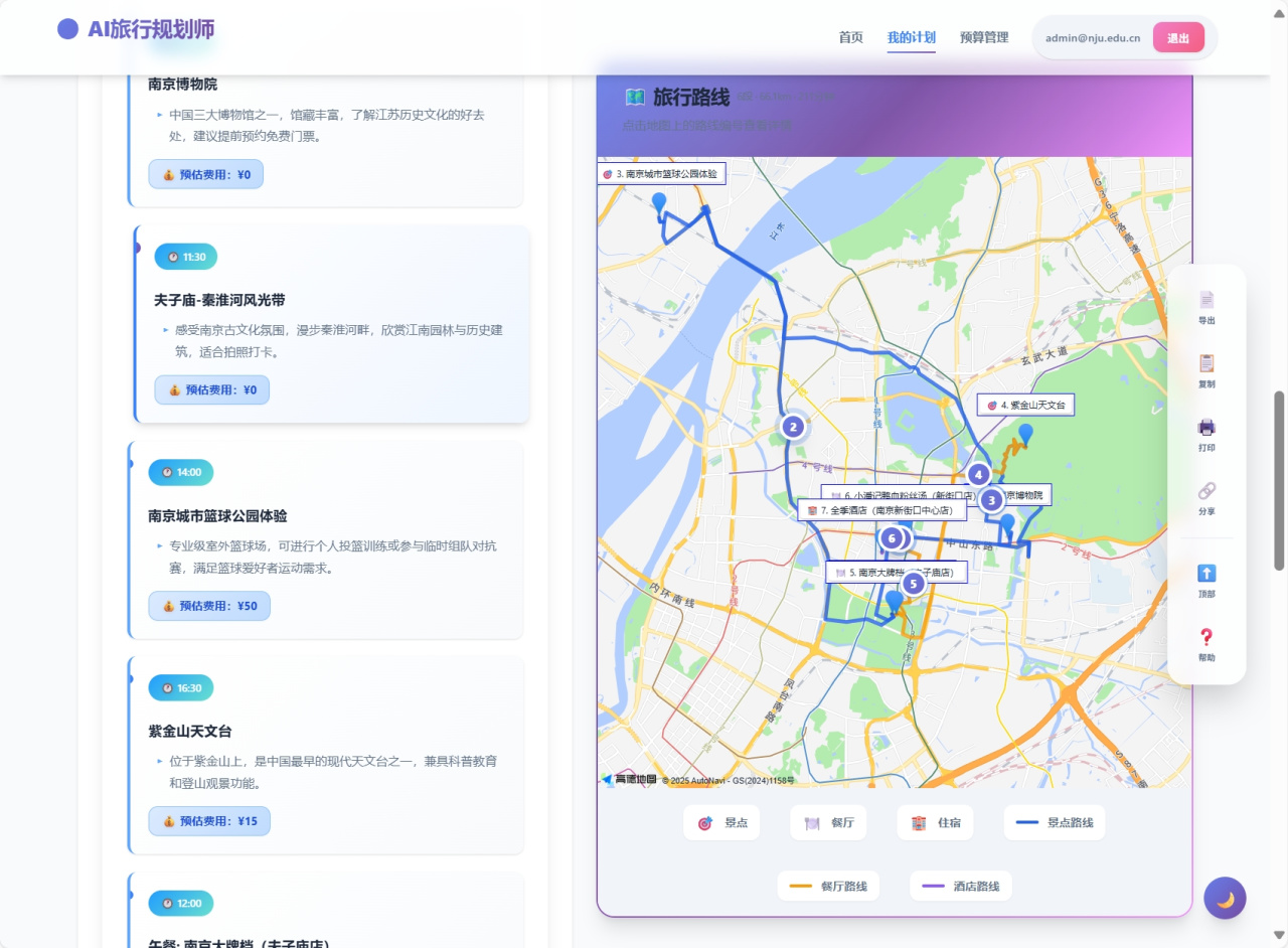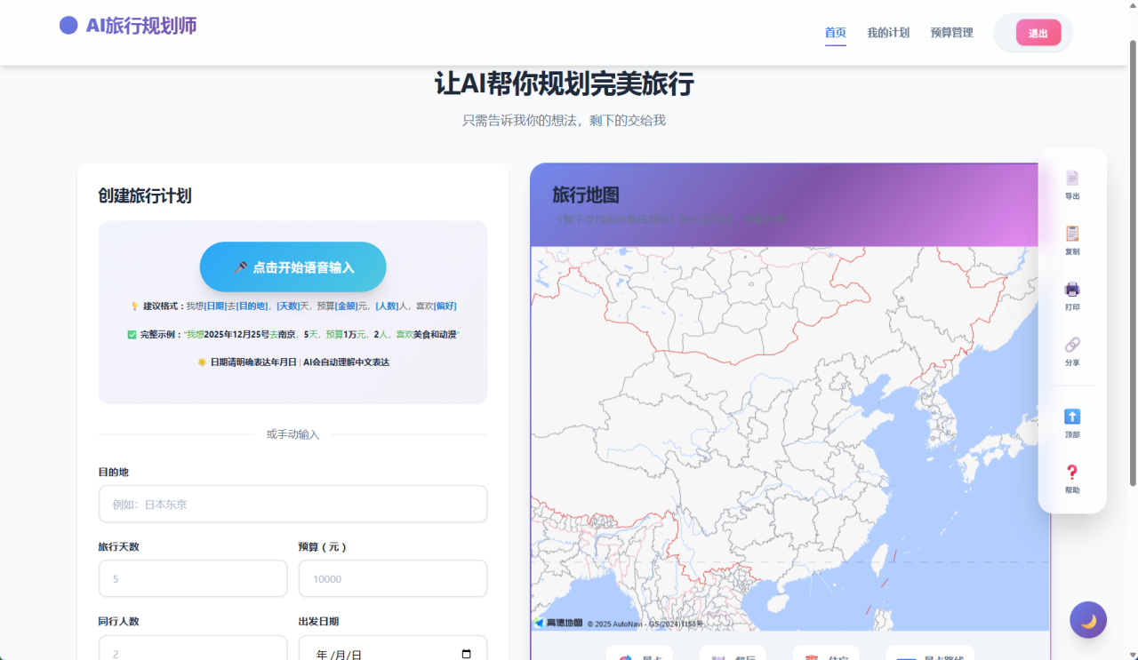 左侧是创建旅行计划,右侧是旅行地图,在顶部还有已经创建过的计划以及预算管理,右边侧边栏支持将计划导出、复制以及打印出来。