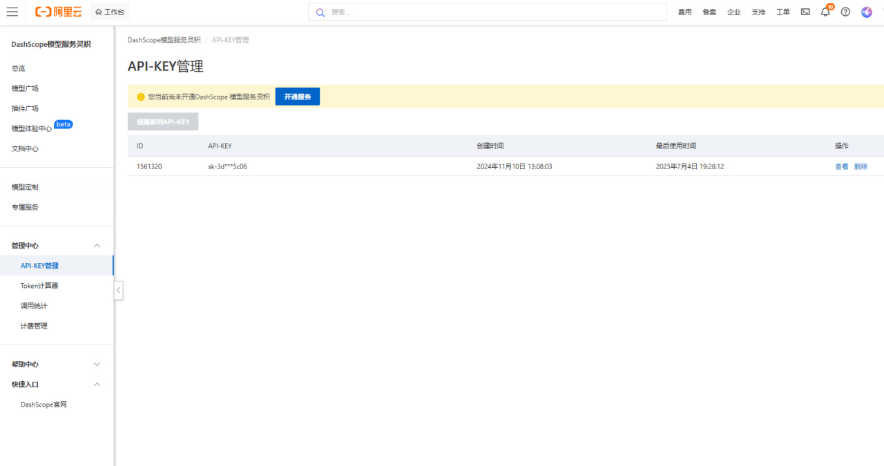 就这就是阿里云的大模型,去阿里的控制台 https://dashscope.aliyun.com/ 申请就行。每个用户都有超多免费额度,只要不是用于 AI 研究开发,基本很难用完。