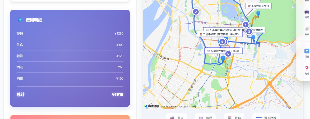 同时在左侧能看到对应的时间点以及各个景点、住宿甚至餐饮的介绍,这些都是直接通过百度地图的API进行提取的,保证证实有效。