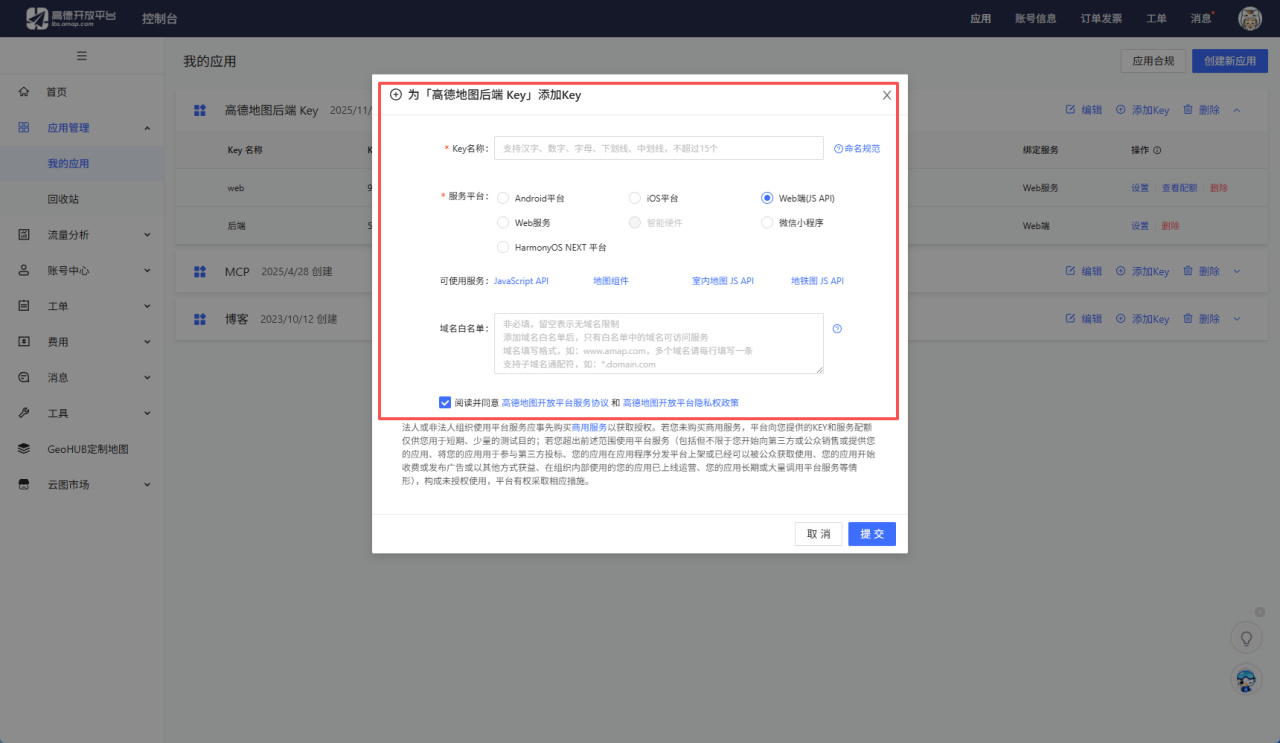 最后最重要的就是百度地图的API,这个一样的,去百度的应用管理中申请就行,也是免费的。https://lbs.amap.com/,登录网址之后点击控制台,随后点击我的应用,在其中新建应用,在添加Key中选择Web端(JS API)即可。