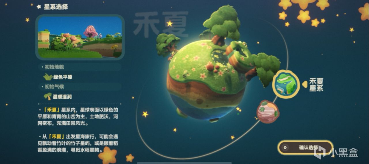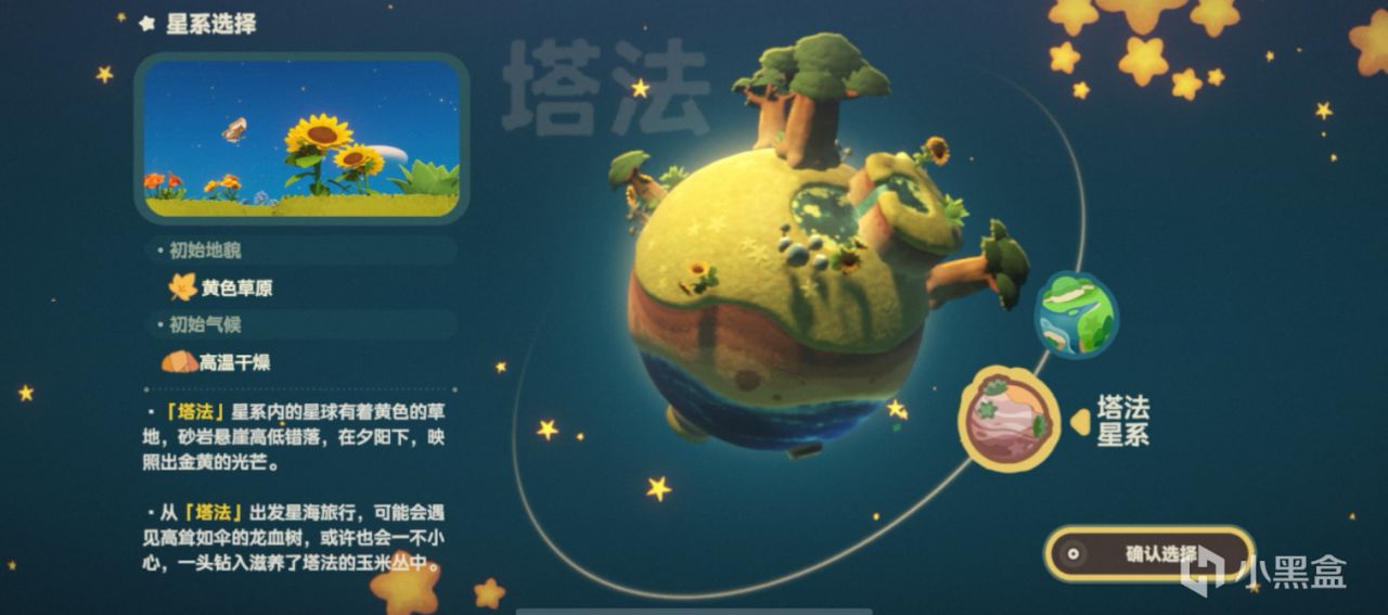 与市面上大部分生活模拟游戏框定一块区域作为玩家属地不同,《星布谷地》游戏中玩家的属地以星球来进行呈现。进入游戏后第一步就是选择独属于自己的星球,首测开放的有绿色平原、气候温暖湿润的禾夏和黄色草原、高温干燥的塔法。