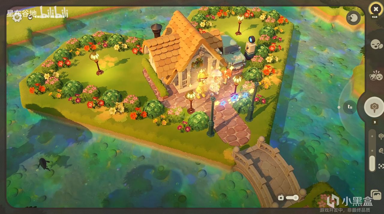 聚焦到星球建设上,随着露卡树不断长大,星球地貌上演变出来更多的地形,也为玩家创作提供了更多的可行性。在《星布谷地》前瞻服,我参观了另一位玩家的星球。前院种上了一片花海,用紫罗兰、黄百合等花卉布置出来颜色层次分明的景色。
