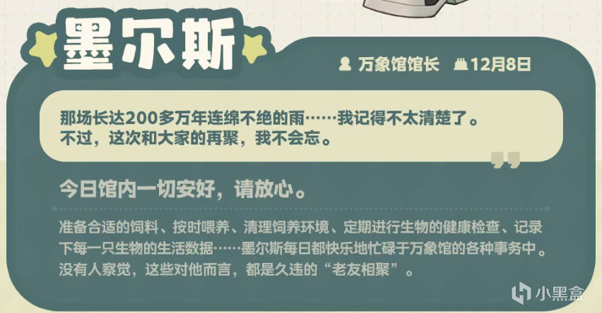 我们在游戏中遇到的第二位友邻墨尔斯同样有着让人捉摸不透的身世背景,虽然游戏中还未揭晓这位万象馆馆长的故事,但从官方介绍中的“那场长达200多万年连绵不绝的雨……我记得不太清楚了”“每一只生物的生活数据……对他而言都是老友相聚”,以及墨尔斯独特的造型,大胆猜测墨尔斯或许是游戏中灭绝恐龙的后裔。