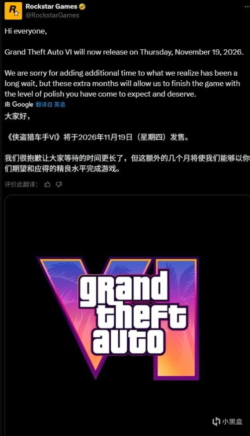 Rockstar今日官宣,《GTA6》發售日從原定2026年5月26日延期至11月19日,消息震驚遊戲圈的同時,也引發其能否參與當年TGA評選的熱議。