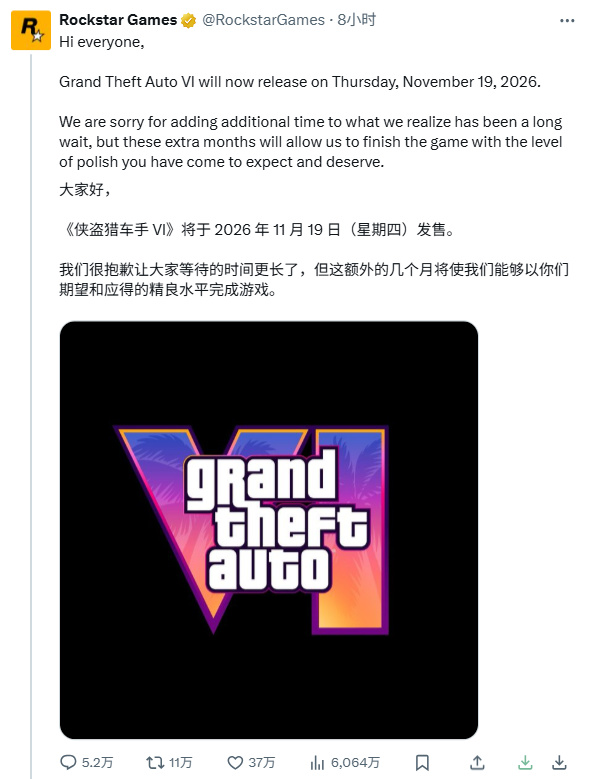 11月6日,Rockstar Games宣布《GTA6》发售日推迟至2026年11月19日。Rockstar Games在X平台发布声明称:"我们为本就漫长的等待周期再度延长致歉,但这些额外时间将确保游戏达到各位期待与应得的精良水准。"