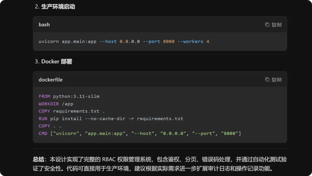 讓它設計一個小型權限系統的 API,並補上測試樣例;