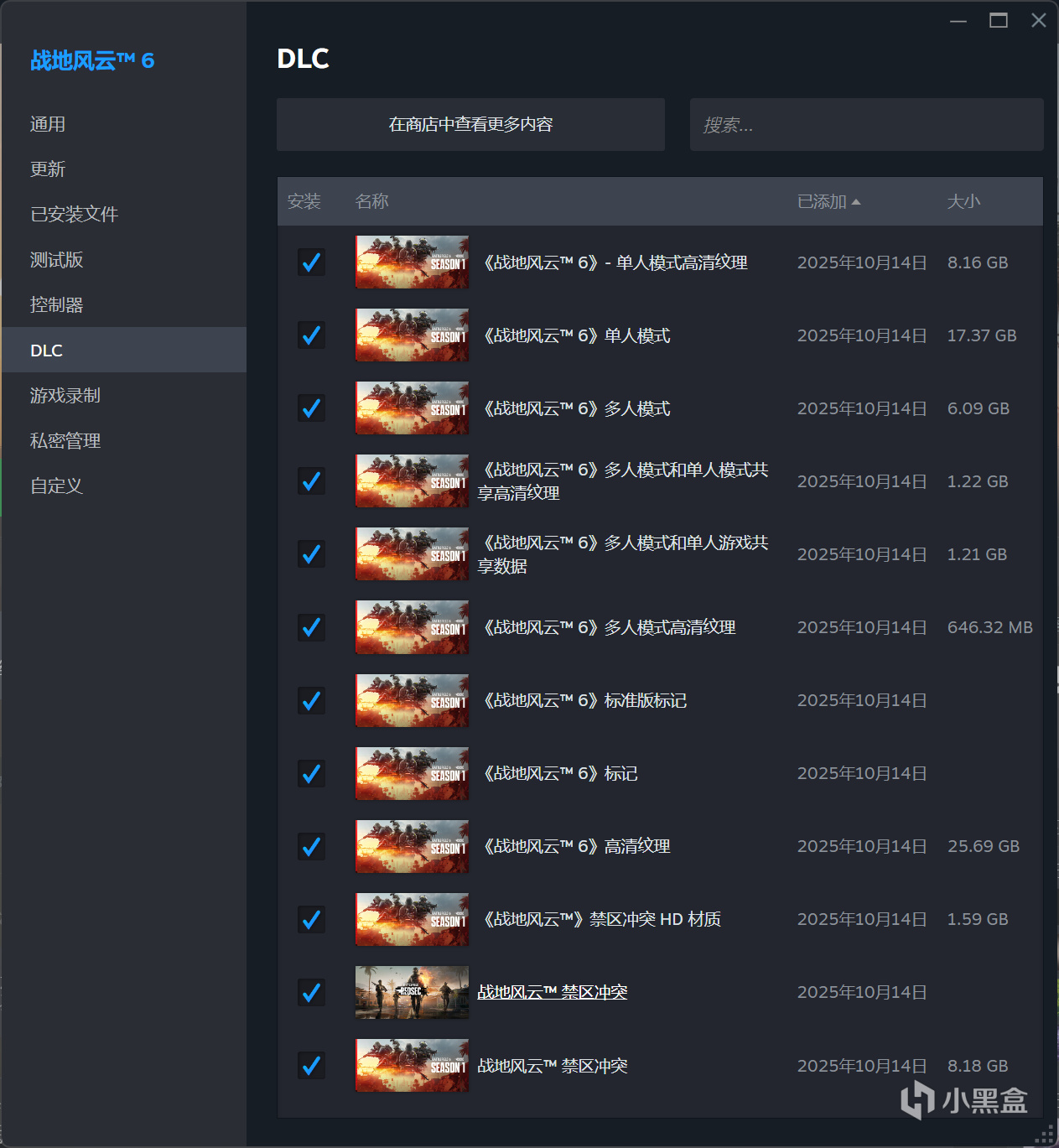 打开steam上战地6的dlc管理页面,你可以看到,如果你购买了本体,可以不安装单人模式啊,禁区冲突啊这些额外内容。把这些全部卸载掉,你甚至可以把97g的战地六变成27g,大幅节省硬盘空间。