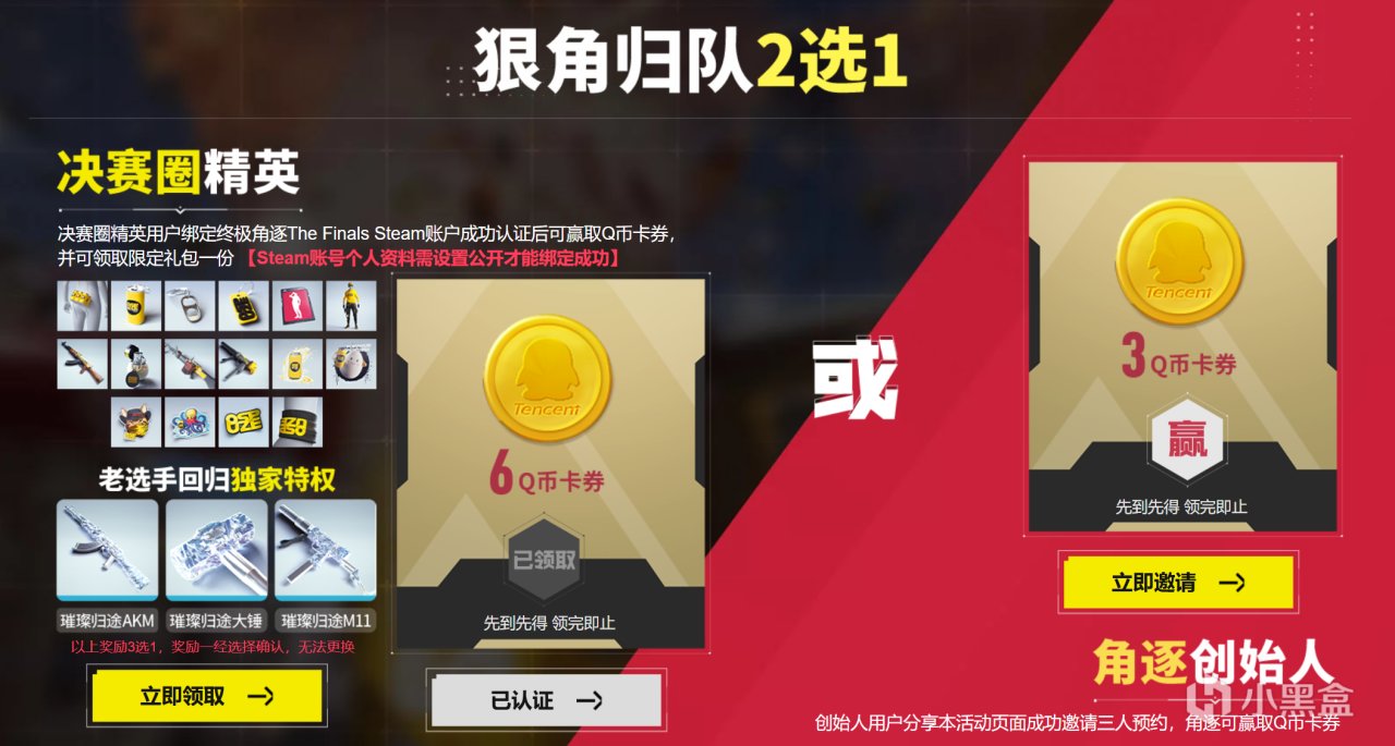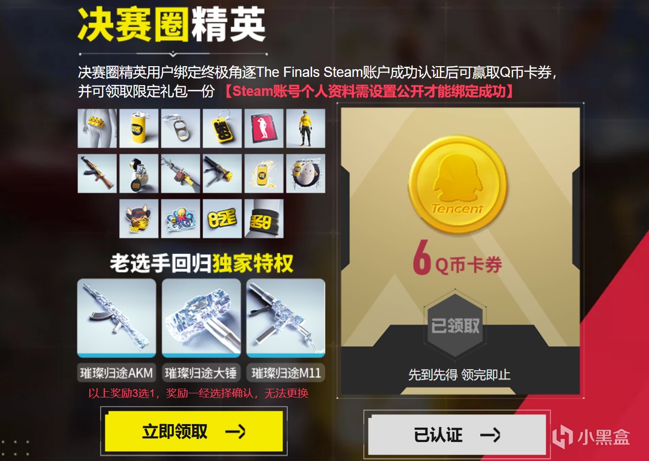 首先就是老玩家自选福利,所谓的“老玩家”官方定义是“只要绑定的 Steam 账号有《The Finals》任意 Steam 成就的记录即被认证为老选手”,绑定成功后可以在璀璨皮肤中三选一,不过要注意在公测上线后才能选择: