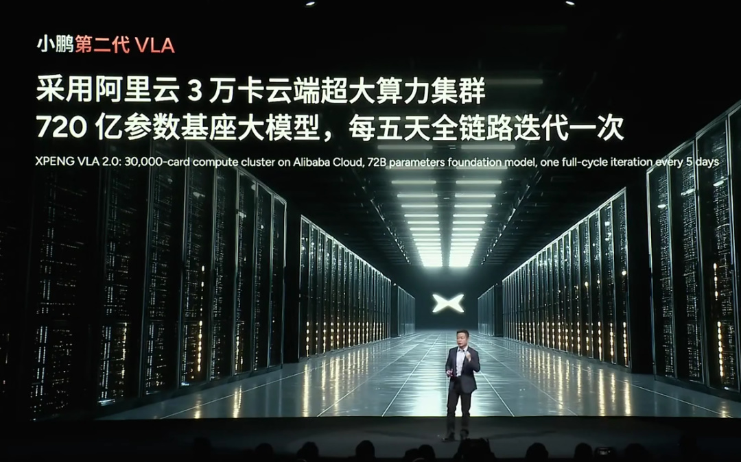 加上云端,还有3万张卡的超大算力集群,让模型不断迭代。明年的小鹏,计划从3万张卡到5万,甚至10万张卡。
