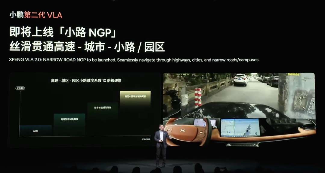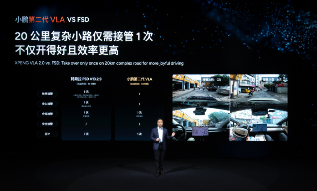 小鹏现场给了一个对比数据,在20公里复杂小路上,特斯拉FSD V13.2.9版本接管5次,而第二代VLA只接管1次。