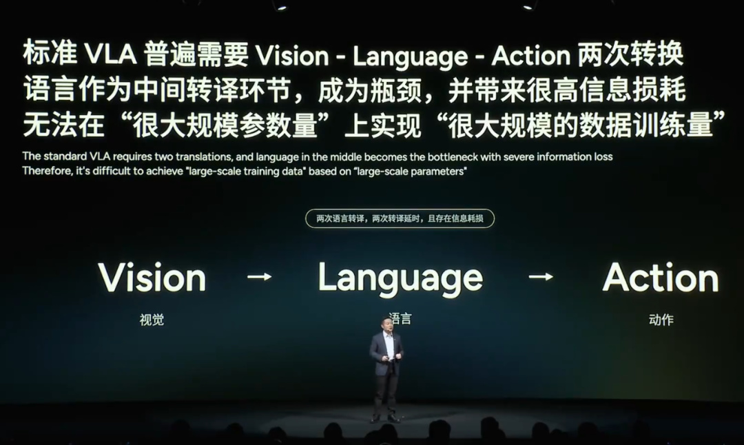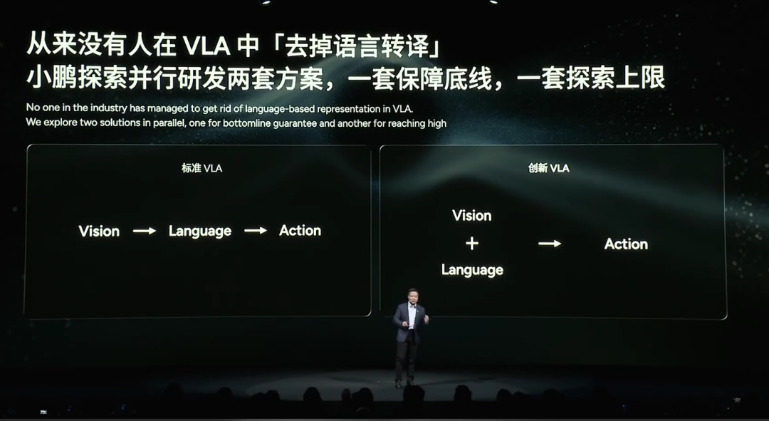 而小鹏的第二代VLA,就是去掉了中间Language的这层转译,把视觉和语言作为输入信息,让它直接生成动作,这种方式其实也更符合我们人类的学习行为。