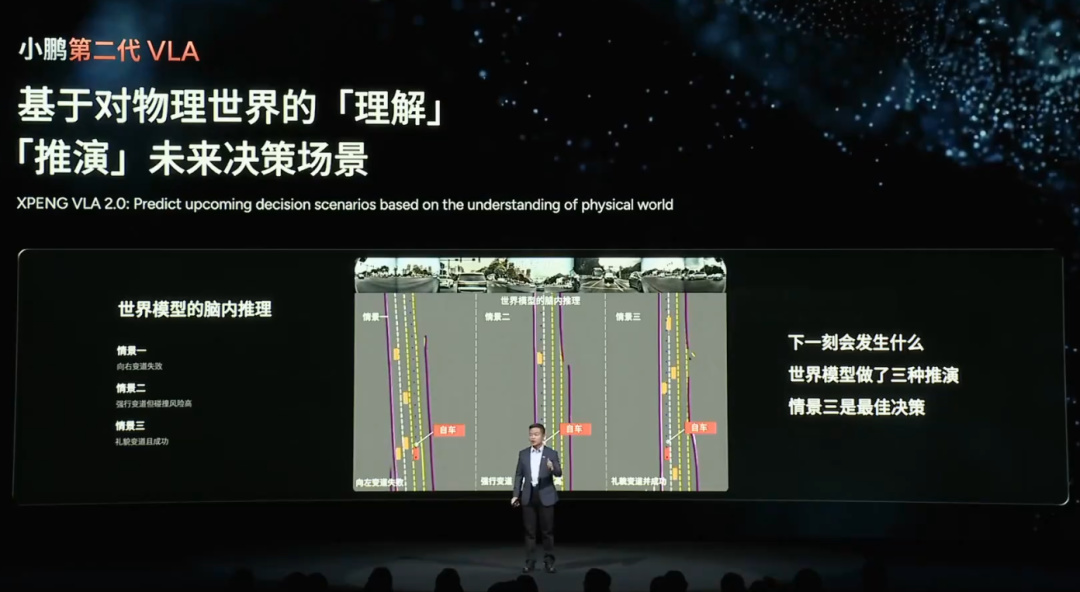 比如说前面车开太慢了,智驾想超车,那向左变道还是向右变道?变道后要不要再变回来?模型会通过快速推理出后面几秒钟的变化,预判别人的预判,从而做出最佳决策。