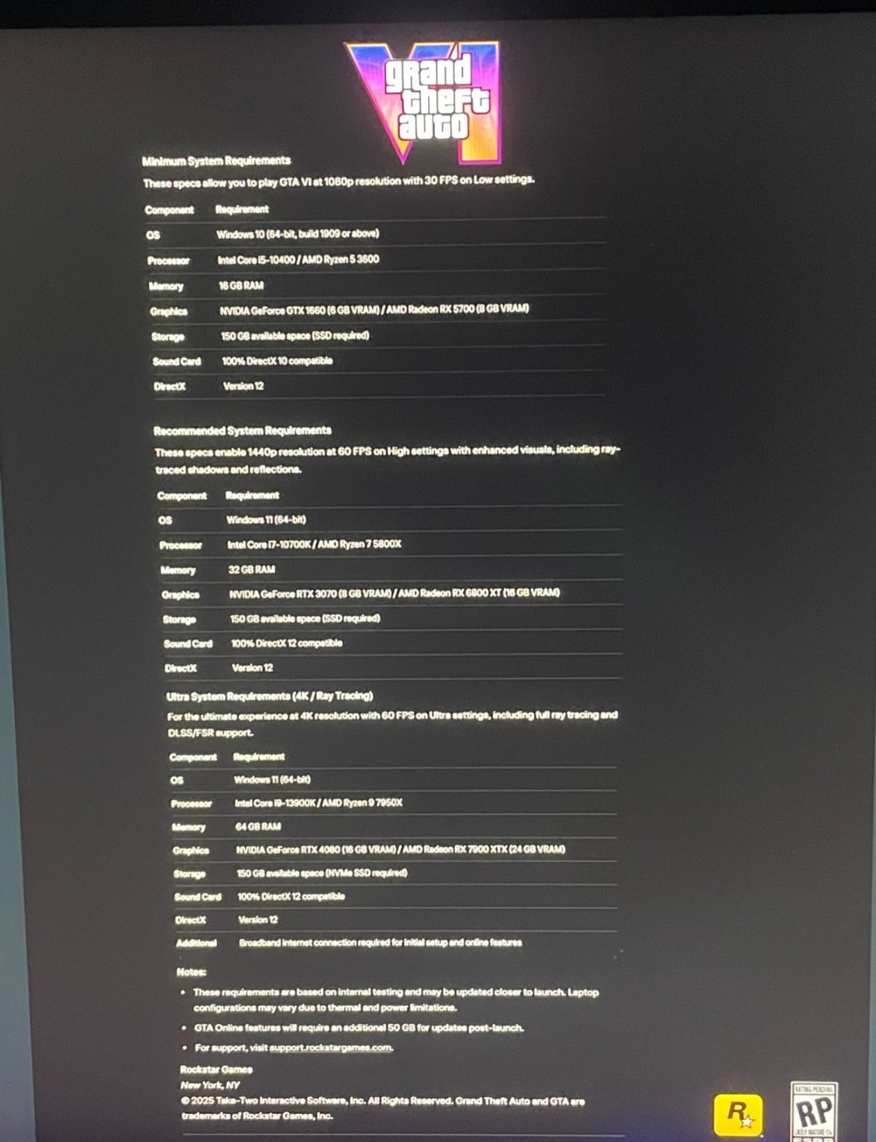 根据泄露图片信息,《GTA6》最低仅需Intel Core i5-10400或AMD Ryzen 5 3600处理器、16GB内存、GTX 1660(6GB)或AMD Radeon RX 5700(8GB)显卡,配合150GB的SSD硬盘空间,即可在1080p分辨率下实现30帧的流畅体验。目前R星仅确认《GTA6》将登陆PS5和XSS|X平台,PC版本尚未得到官方正式确认。尽管该配置要求看起来对玩家友好,但其图片真实性极为可疑。玩家应谨慎看待这一泄露信息,以官方最终公告为准。