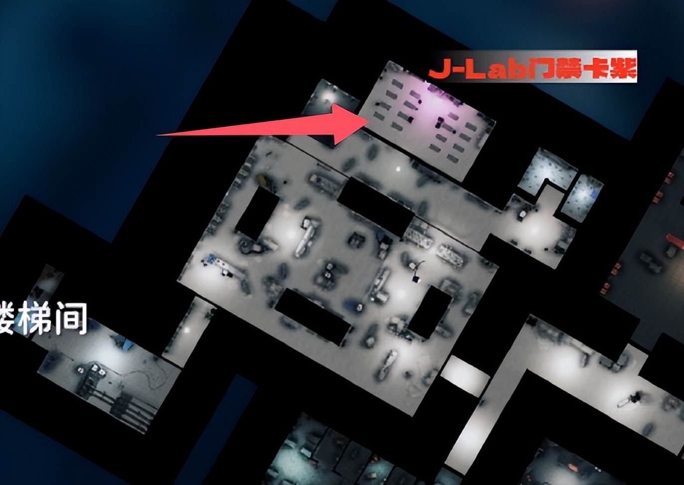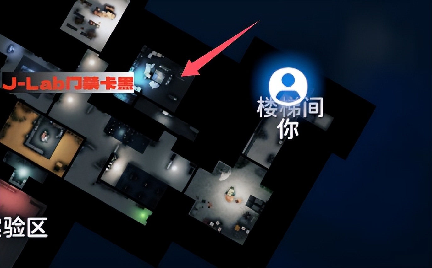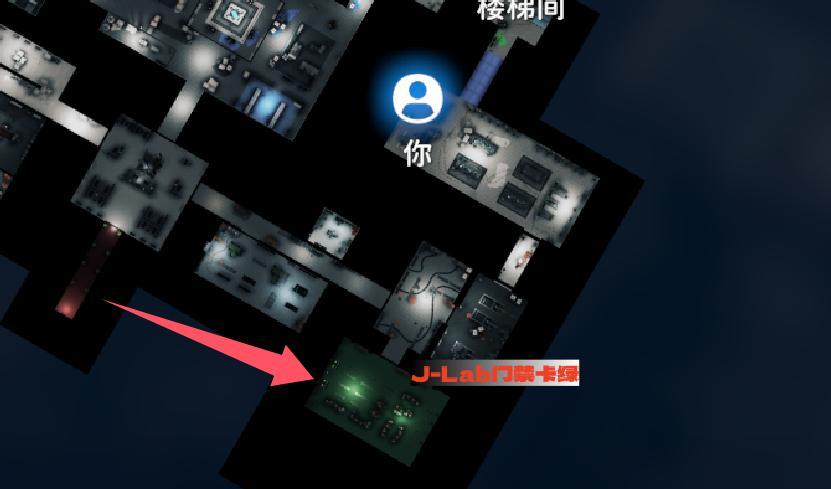 很好找我们进实验室的入口,对直往前走就能找到,因为是放映室用的投影,切大地图看到是黑的。这个地方有游戏卡带,有J-Lab箱是个不错的物资点。