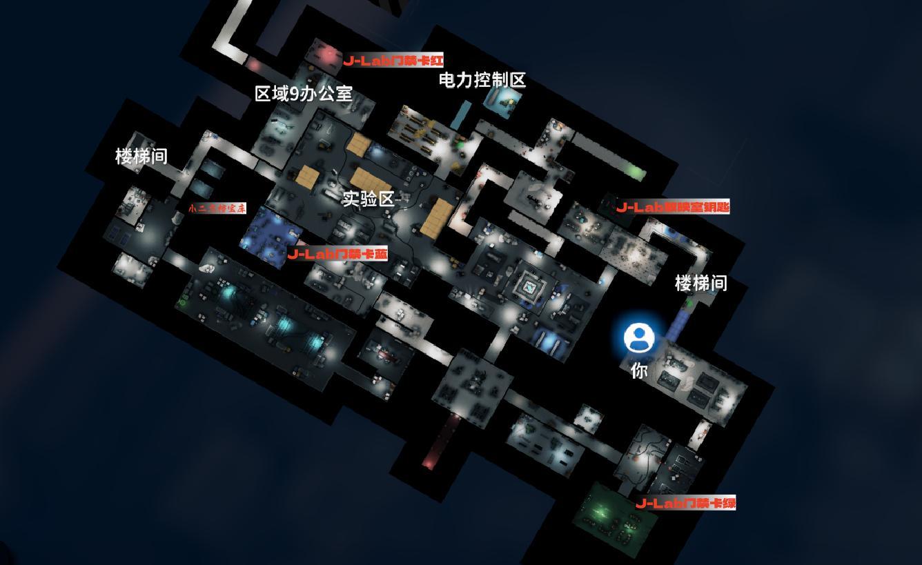 地下一层一共有4把钥匙分别是,J-Lab放映室钥匙、J-Lab门禁卡红、绿、蓝,下面就用颜色简称了。