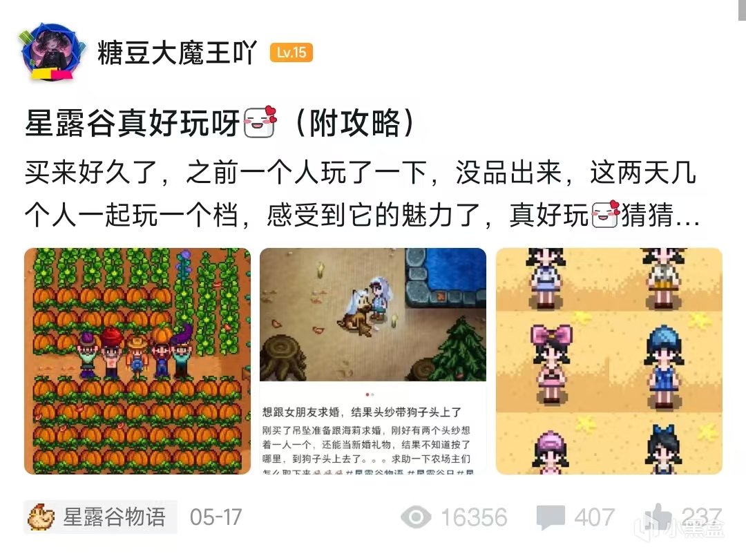 5月和上面說的搭子羣的人一起玩星露谷,發了一個帖子,附上了自己到處找的攻略圖,有了500多盒友收藏使用