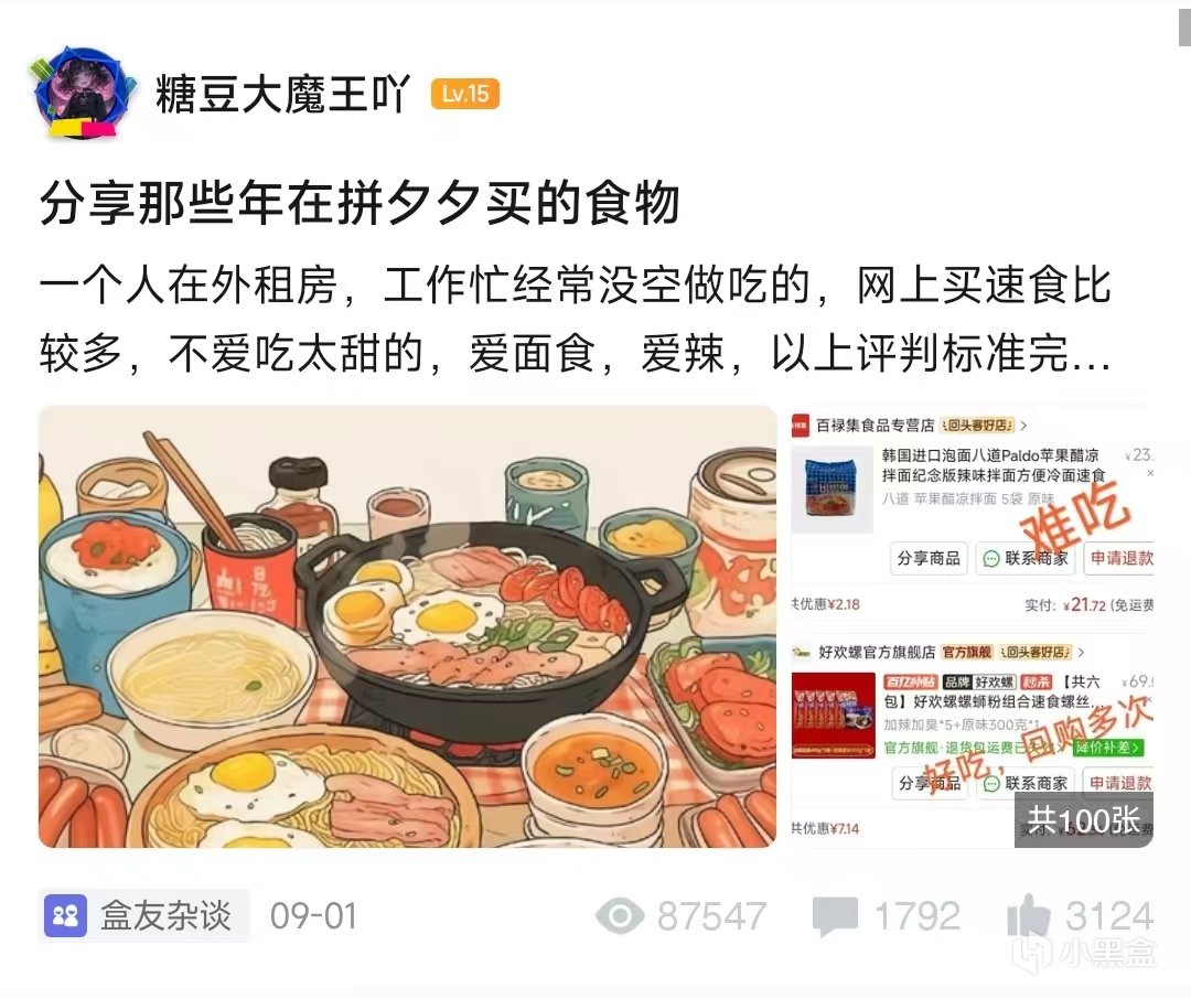 有一天突發奇想的想分享我買過的食物,於是一個個截圖發了出來,沒想到獲得了快7000的收藏https://api.xiaoheihe.cn/v3/bbs/app/api/web/share?link_id=50fc70d208e8