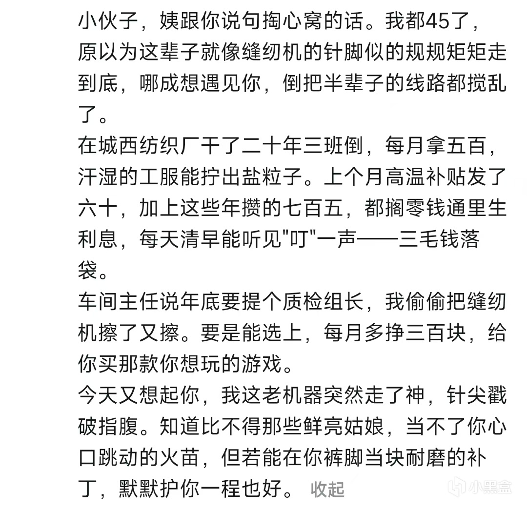 這個帖子裏,有盒友發了一段“丫頭,叔和你說一段掏心窩子的話”的梗文,我回了一段阿姨版本的,當時挺多人插眼點讚的,後來這個評論不知道爲什麼沒了,後來我逛黑盒的時候時不時會看到這一段,還會暗暗好笑,可能沒幾個人知道這段是我寫的,哈哈哈