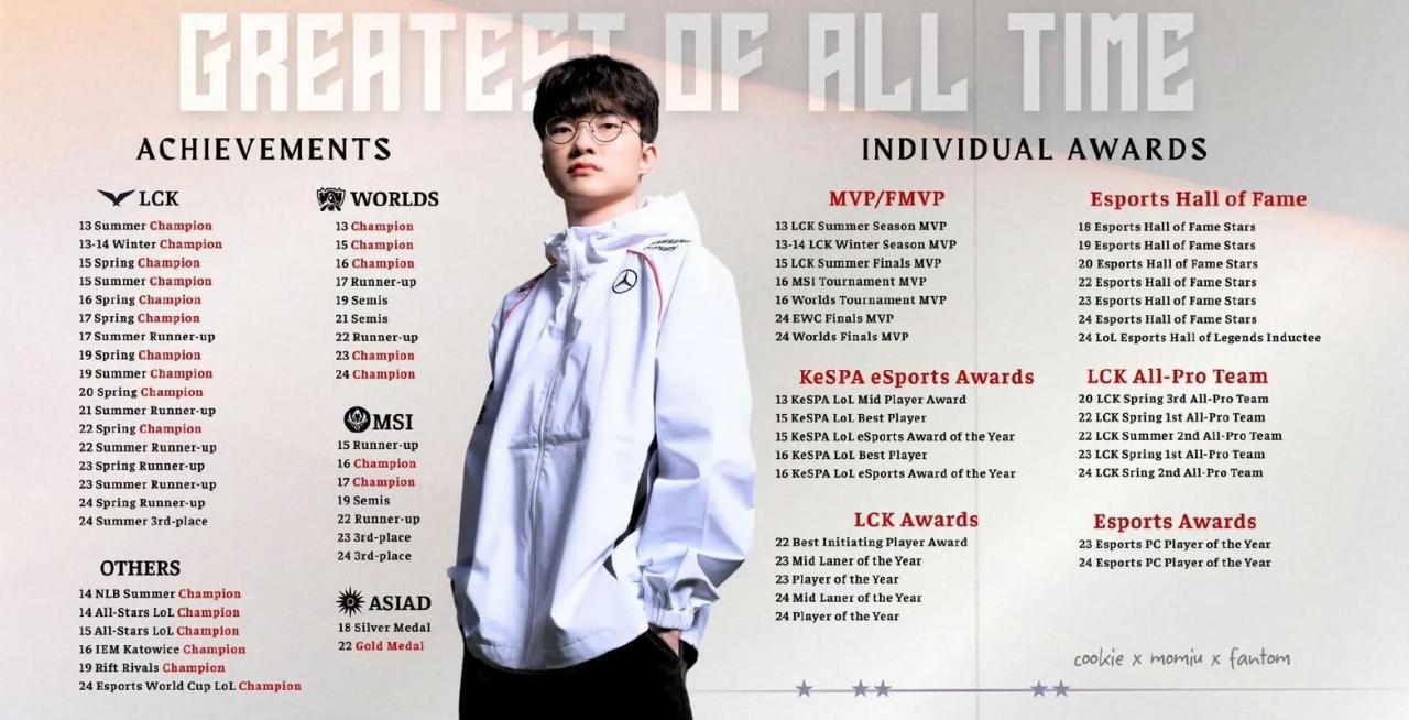 截至2025年,Faker的荣誉簿:5次全球总决赛冠军、10次LCK联赛冠军、2次MSI冠军、1枚亚运会金牌,英雄联盟名人堂首位入选者,还保持着“最年轻S赛冠军中单”“最年长S赛冠军中单”“夺冠次数最多”三项世界纪录。
