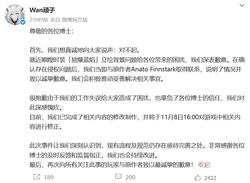 11月8号,鹰角网络运营官方 账号@Wan顽子 发文道歉。