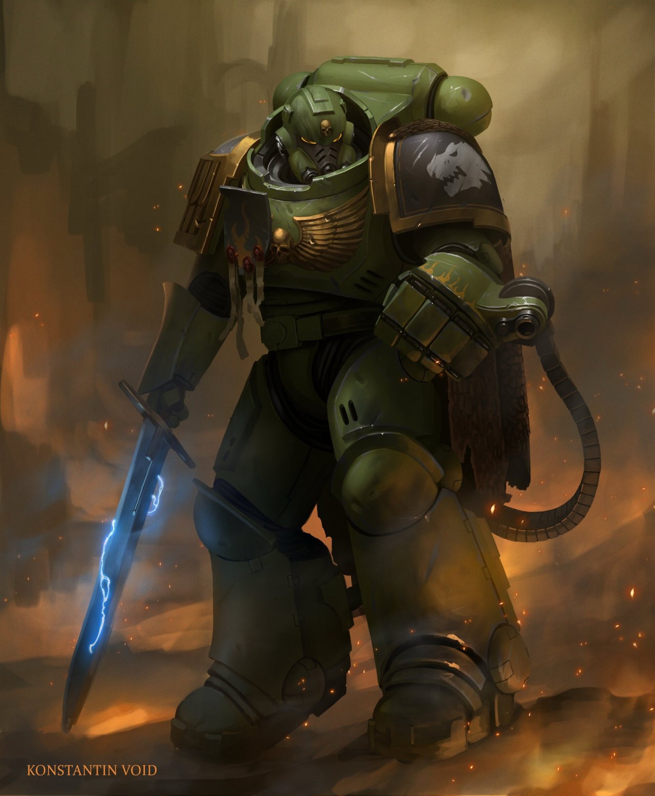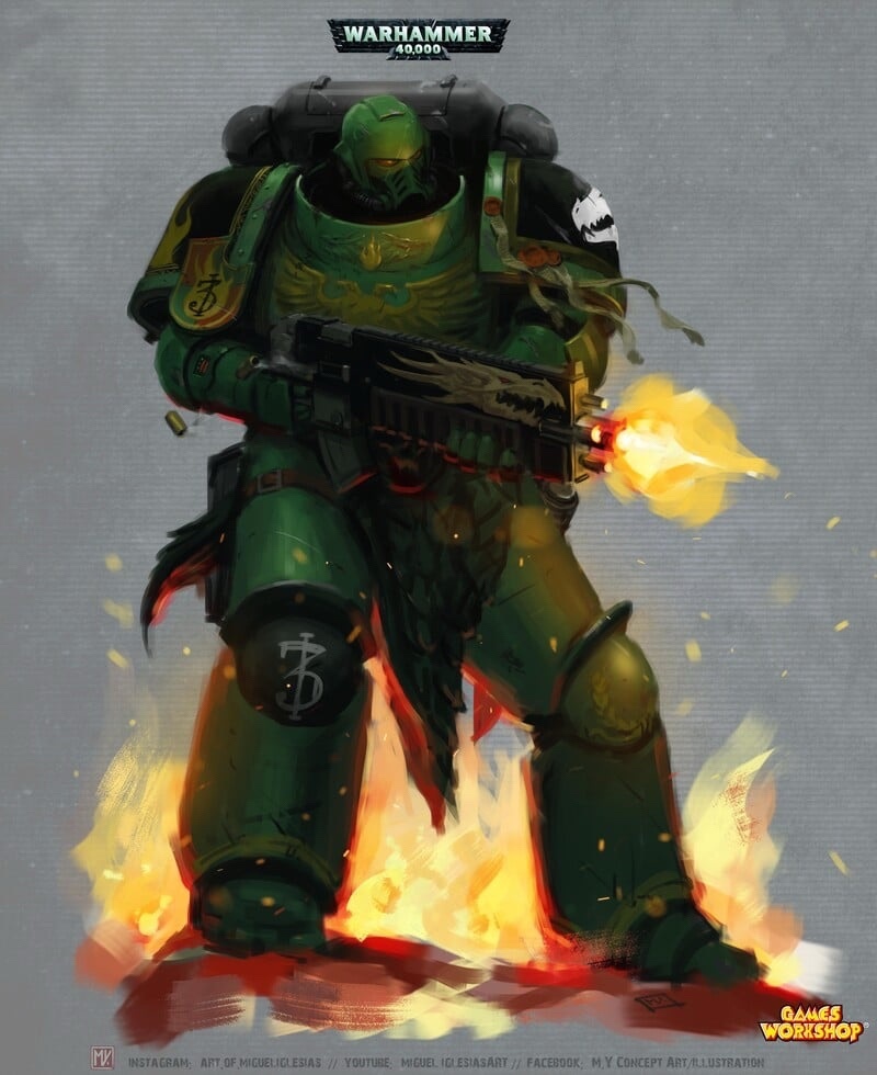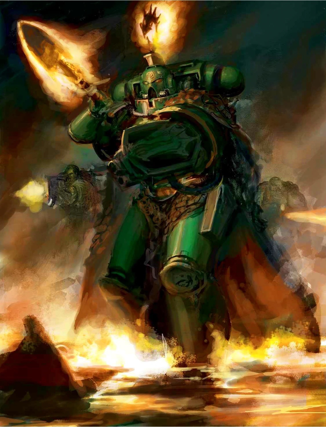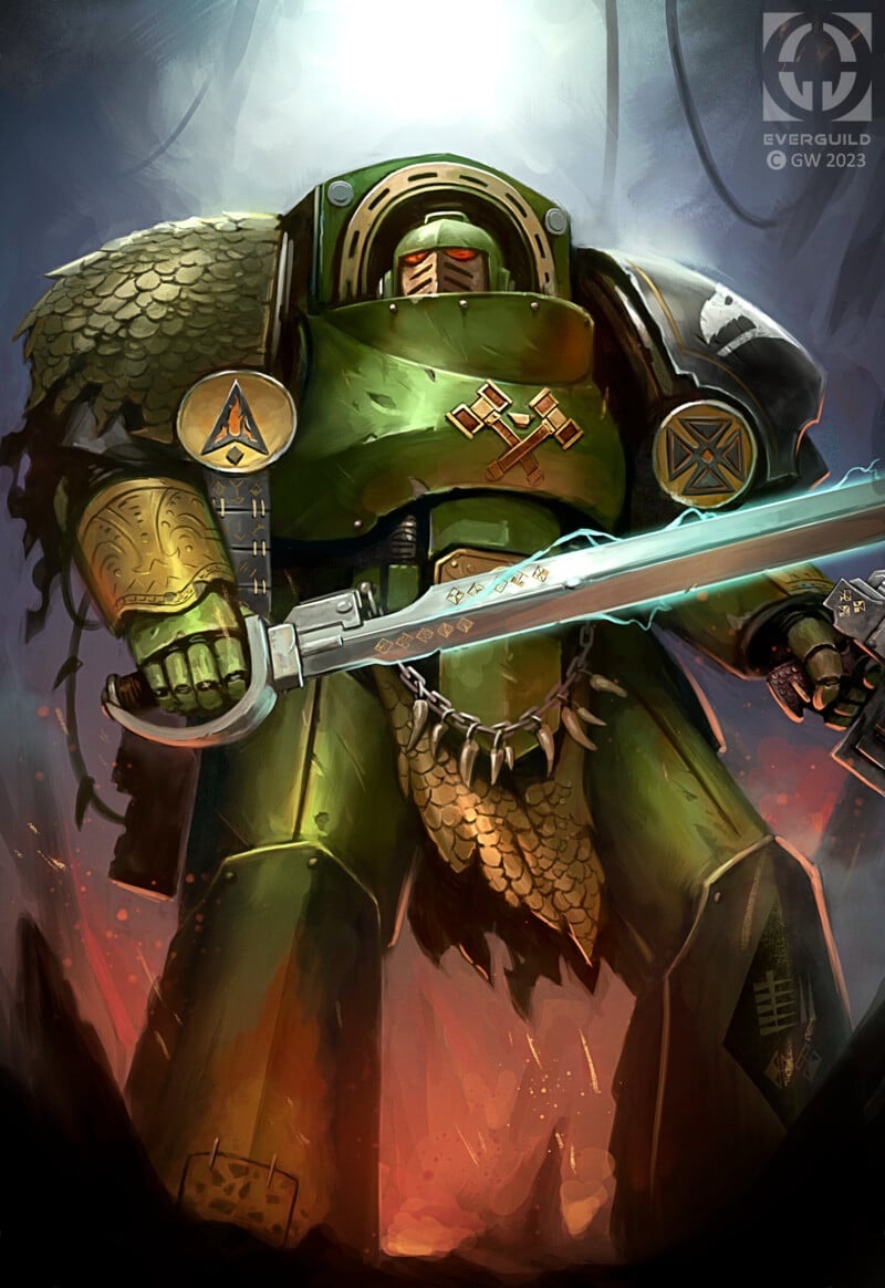墨綠動力甲、金色胸甲與肩甲飾板,左肩繪有灰白色“火蜥蜴/龍首”團徽。兩肩之間垂着帶火焰紋的小旗與聖印,右肩覆有類似“龍皮披風”的質感。戰士右手是加厚重手套/強攻手套,左手持一柄電弧遊走的能量劍。