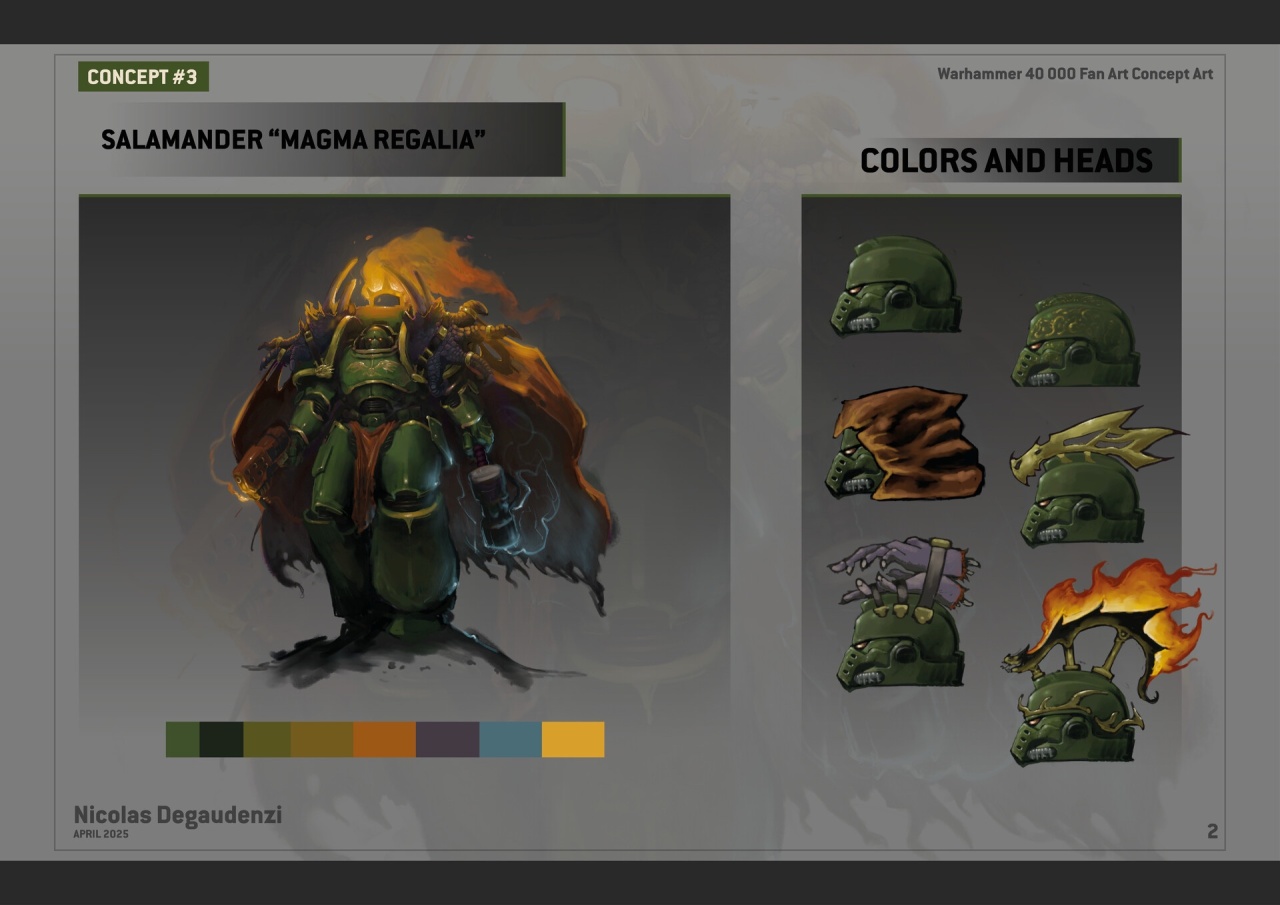 “這個概念強調以真實的生物戰利品進行儀式化裝飾:來自永夜星(Nocturne)原生巨型龍類的斷爪。爪件被直接裝在肩甲上,高出肩線,以強化星際戰士的輪廓——像一頂骨之王冠,或一座活的圖騰。兩爪之間披掛禮儀斗篷,以刻紋金屬環與精工鎖鏈固定。整體設計體現了火蜥蜴戰團的二元性:在戰鬥中鍛鍊成鋼的殘烈武士,同時又是恪守傳統與先祖榮譽的虔敬守護者。”