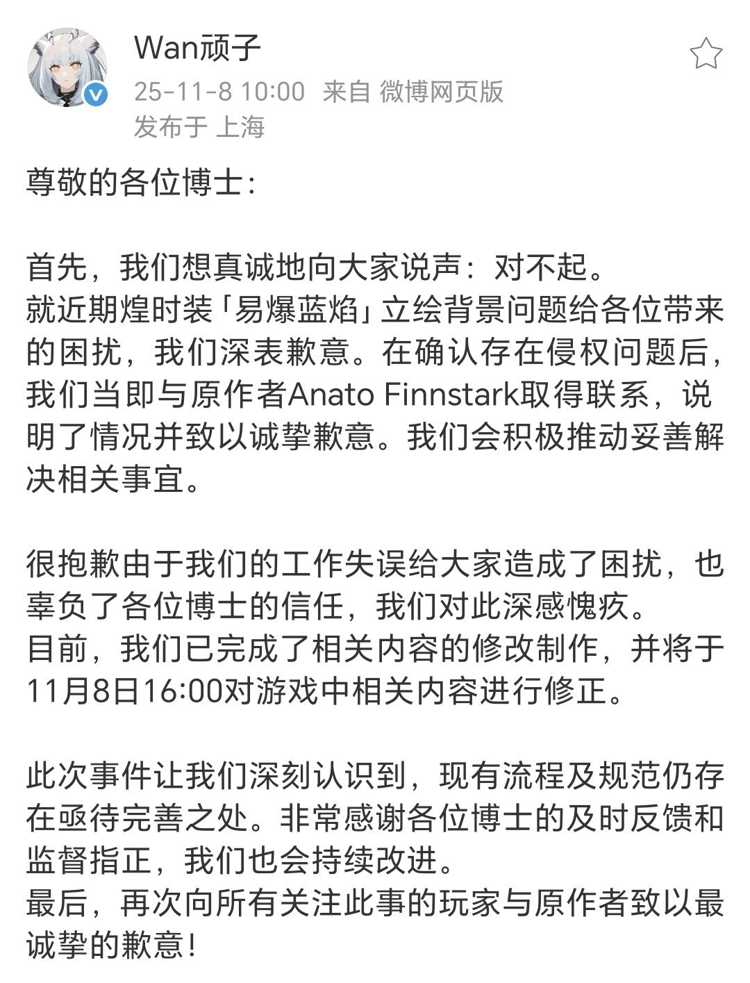 官方確認煌時裝「易爆藍焰」的立繪背景存在侵權行爲,同時已與原作者Anato Finnstark取得聯繫並致以誠摯歉意。