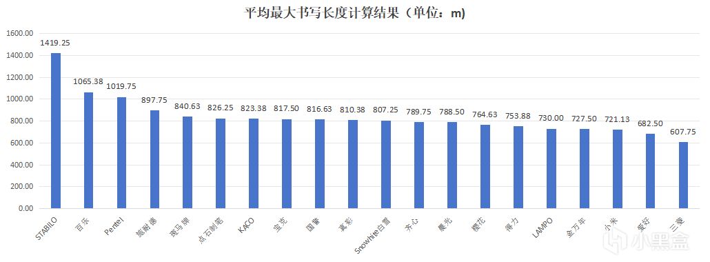 比如在最能反映中性笔能正常书写的指标的最大书写长度,各品牌的平均最大书写长度在607.75米~1419.25米之间,数值越大,表现越好。记录方式为正常划线(即线迹无明显断线、变淡现象时)的最大长度,结果取平均值。