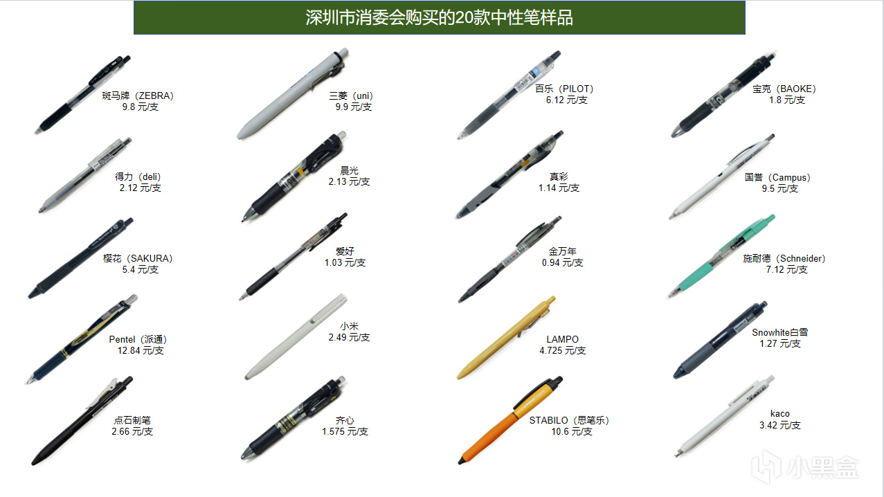 今年9月份,深圳市消委会对中性笔产品开展比较试验,工作人员以普通消费者身份从线上、线下购买规格统一的中性笔样品,涉及得力、晨光、真彩、爱好、宝克(BAOKE)、金万年、小米、LAMPO、Snowhite白雪、点石制笔、齐心、Kaco、斑马牌(ZEBRA)、三菱(uni)、百乐(PILOT)、国誉(Campus)、樱花(SAKURA)、施耐德(Schneider)、Pentel(派通)、STABILO(思笔乐)共20个品牌。单支中性笔价格从0.94元~12.84元不等。