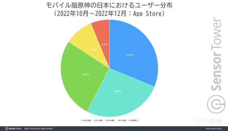 從年齡結構來看,日本的《原神》手遊端用戶在中青年年齡段分佈相當平均,18-24歲、25-34歲以及35-44歲用戶佔比分別爲31.2%、26.3%和26.7%,甚至有6.2%的玩家在55歲以上,可謂是真正的“全年齡向”遊戲。