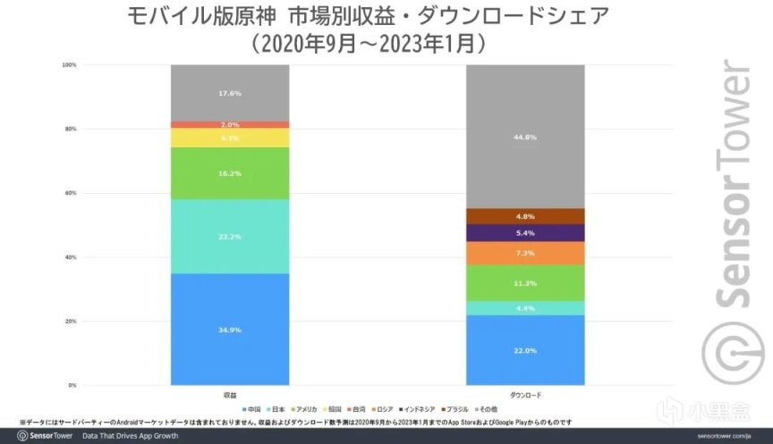 該報告還顯示,中國大陸、日本、美國和韓國是《原神》最大的四個收入來源市場,佔比分別爲34.9%、23.2%、16.2%和6.1%。
