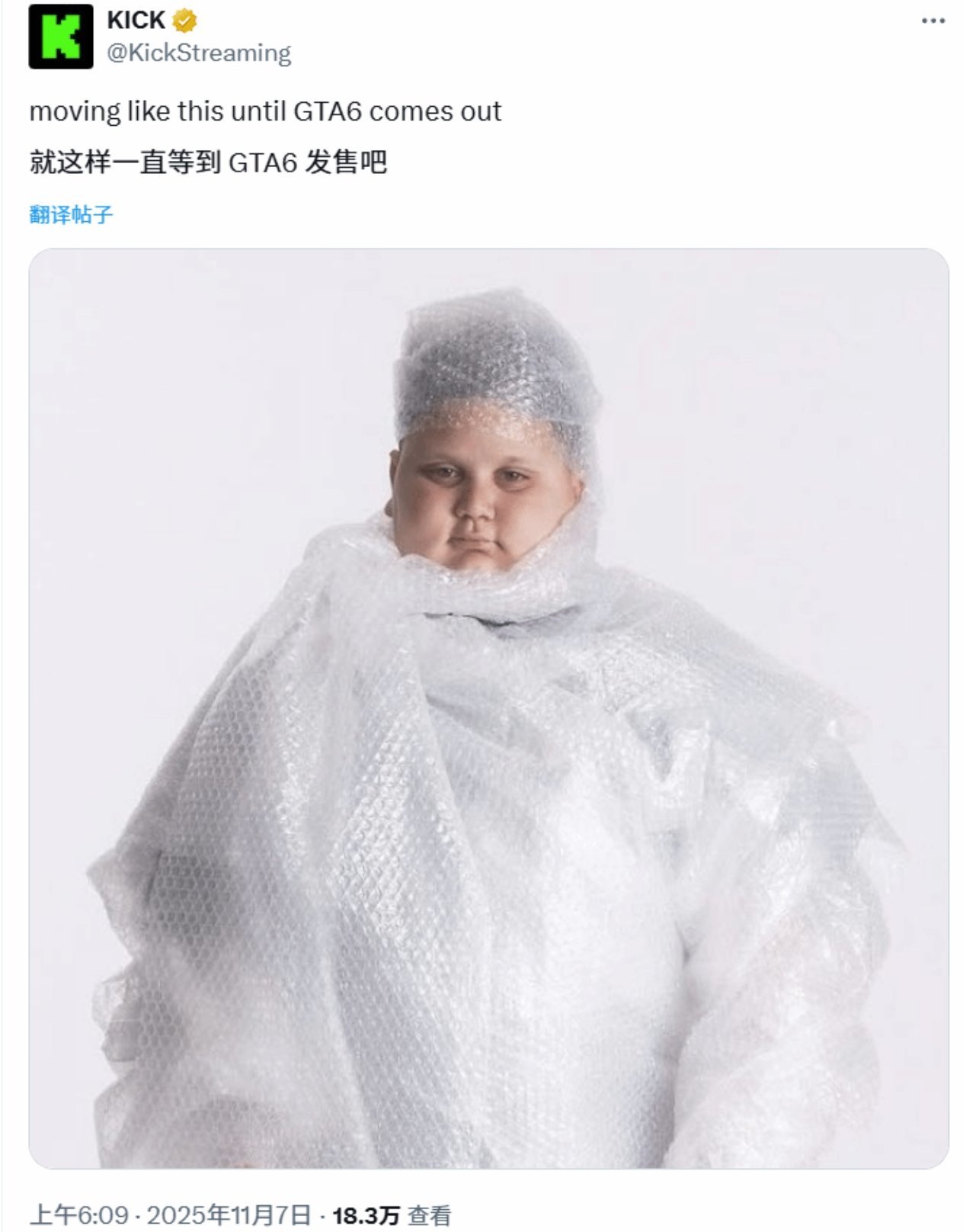 达美乐披萨英国官方账号率先出击:“如果你们需要帮助派送(游戏),请给我们打电话。”巧妙将核心业务“派送”与R星的“交付困难”联系起来。KFC则贴出《GTA:圣安地列斯》开场画面,暗示连肯德基都知道R星不该一再延期。深谙跳票之痛的《赛博朋克2077》官方转发了自己2020年的旧推文“不会再有任何延期了”,用自黑方式进行高端嘲讽。流媒体平台KICK则发布了一张小孩全身包裹气泡膜的图片,配文“在《GTA6》发布前,我们都要这样移动”,表达了对进一步“伤害”的预防。这场集体吐槽展现了品牌营销的快速反应能力。这些幽默互动既缓解了玩家的失望情绪,也为品牌带来了大量曝光。