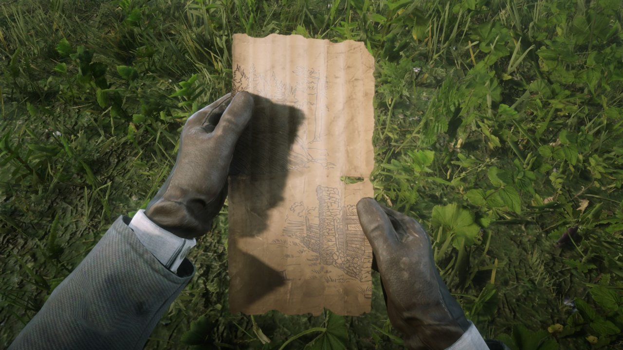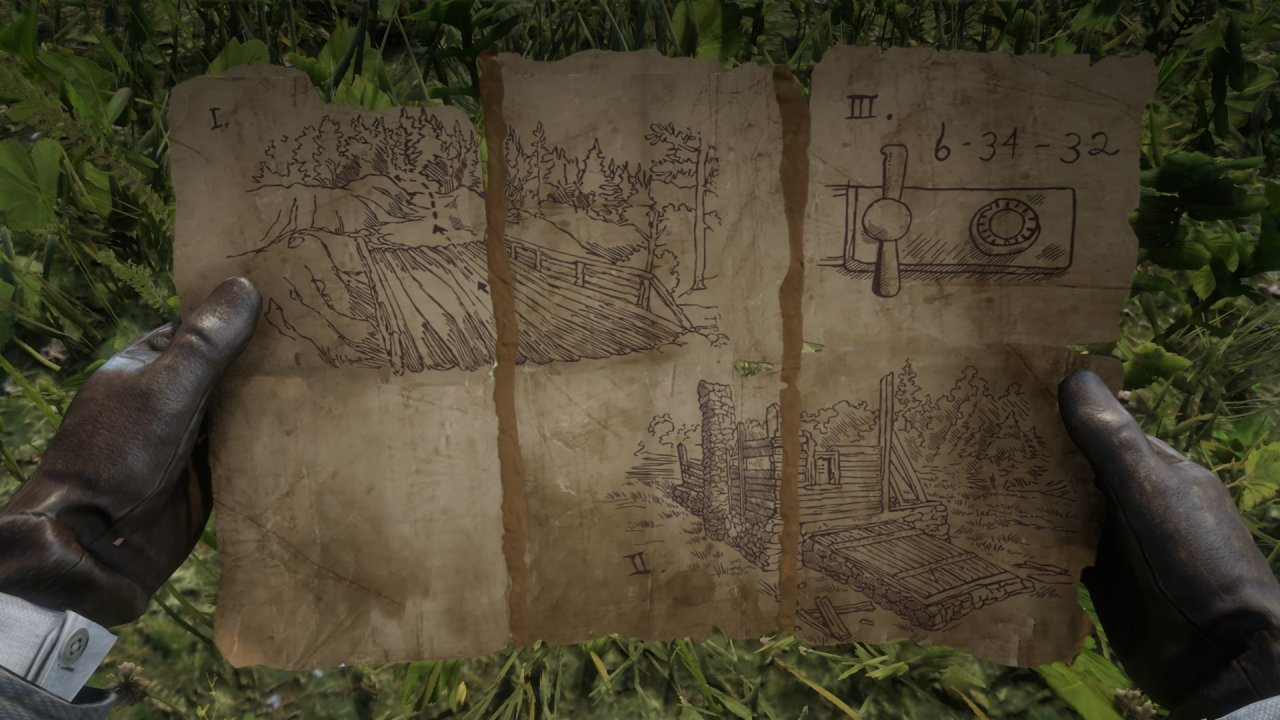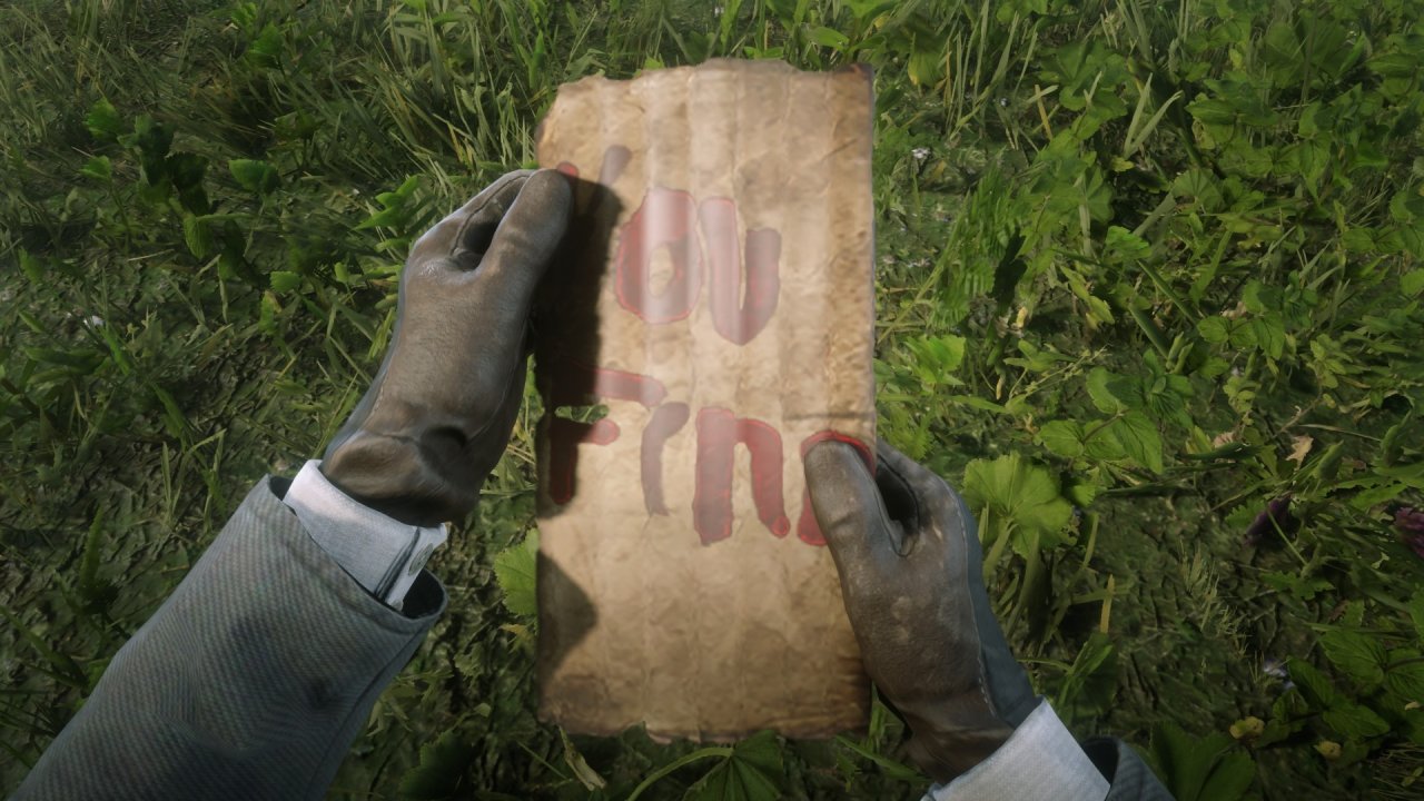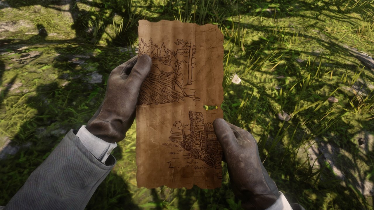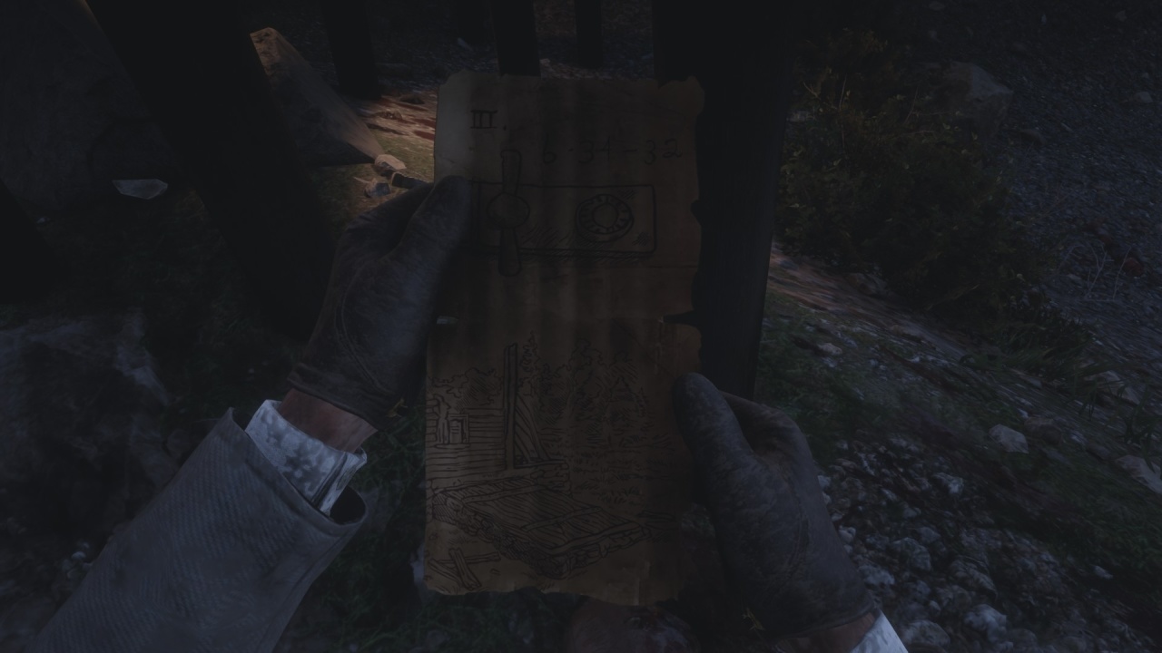 • 被害人的腦袋被匕首釘在木樁上,那有一卷紙,是……地圖?後面還有不完整的字……散落的地圖碎片嗎。