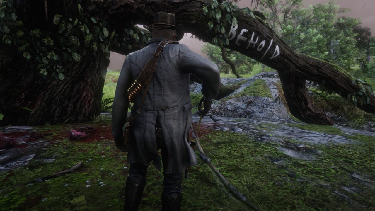 • 又是一個被拼湊的屍體,地上散落的組織還留戀着腹腔的溫度,樹幹上又陶醉地寫下了“behold”:看