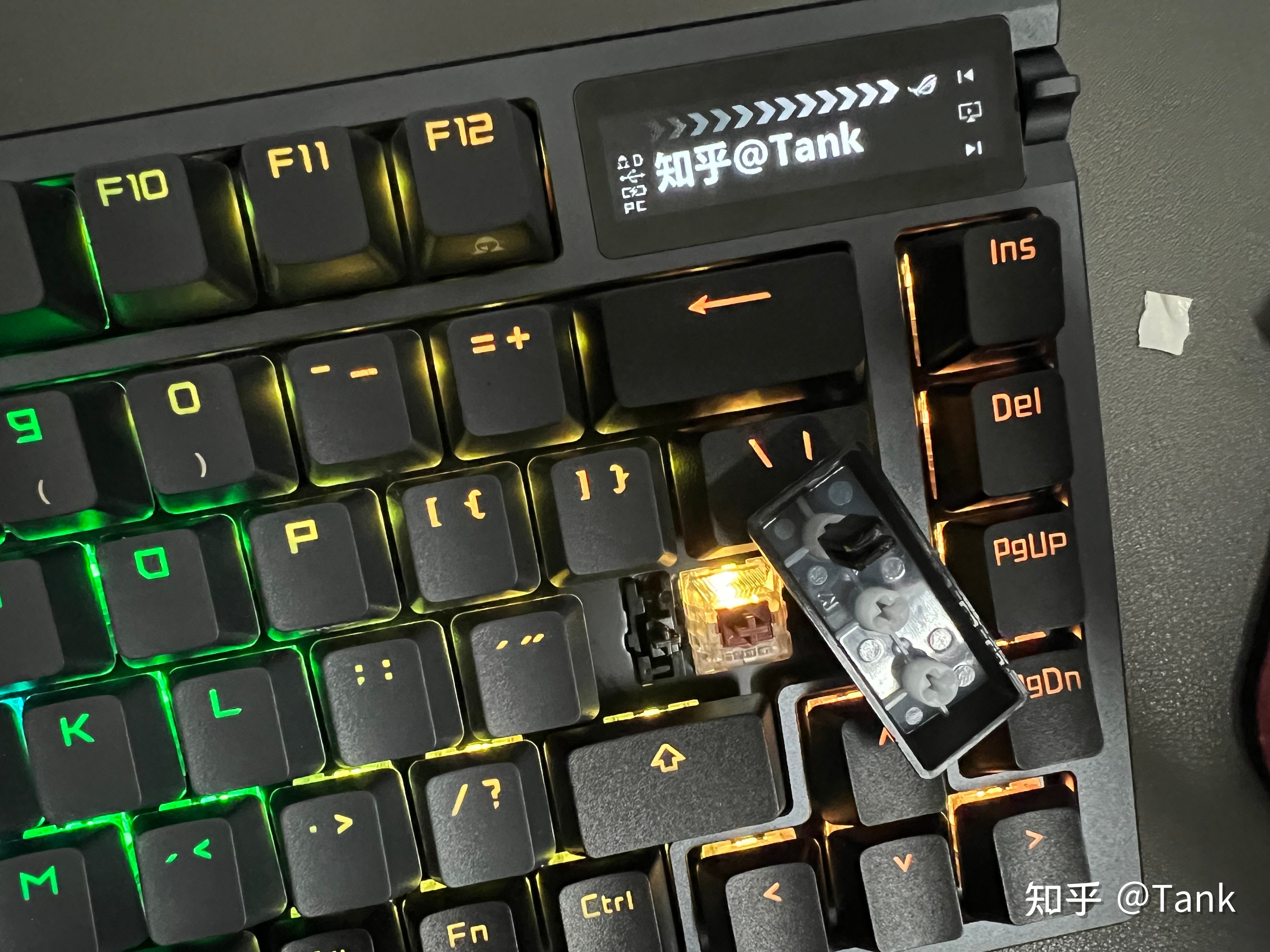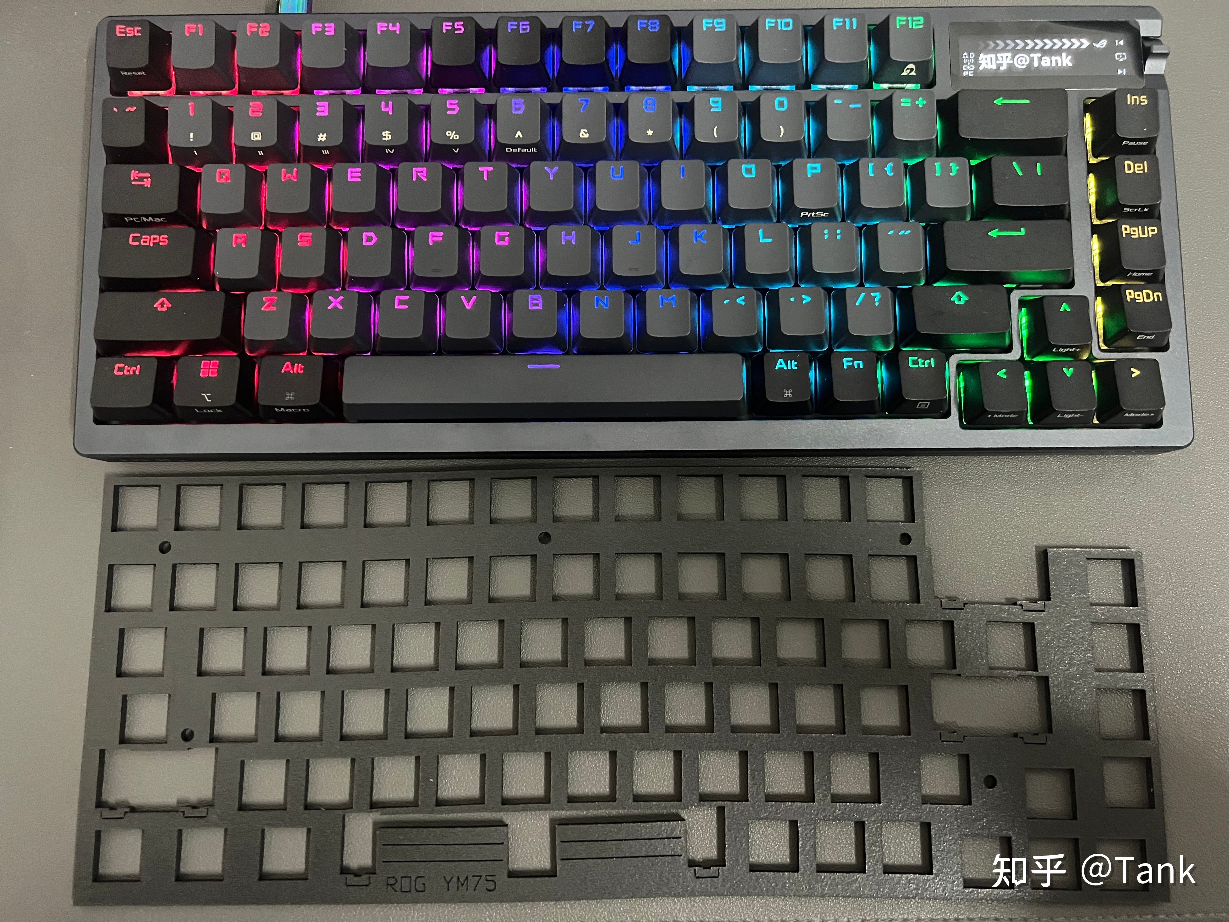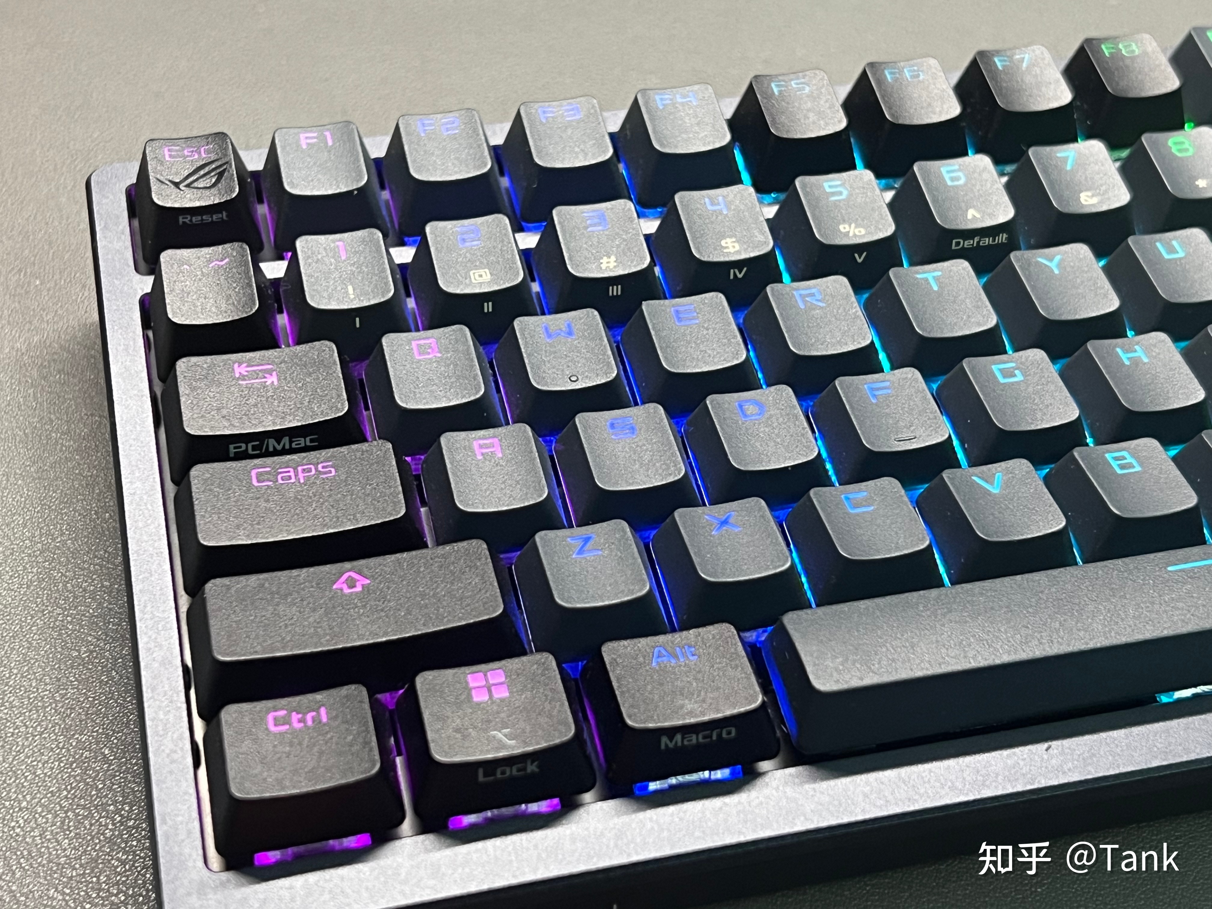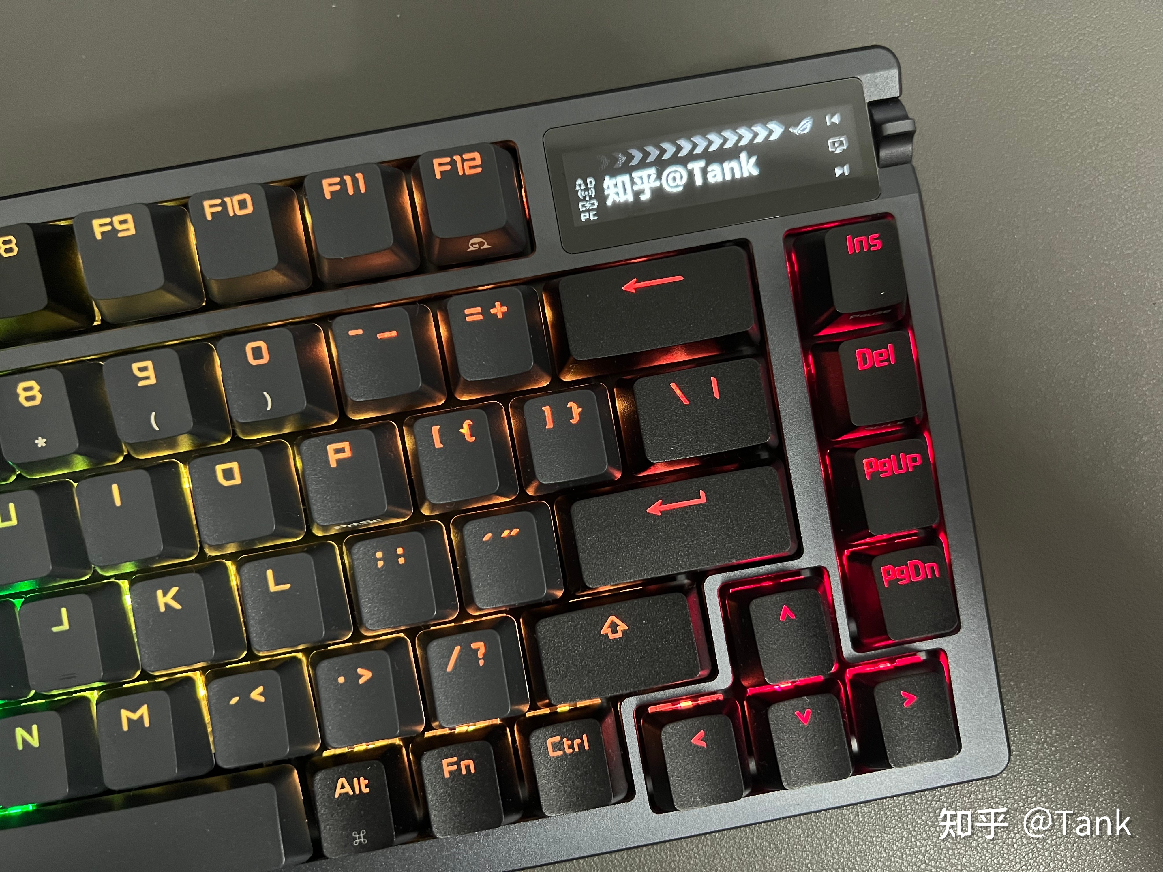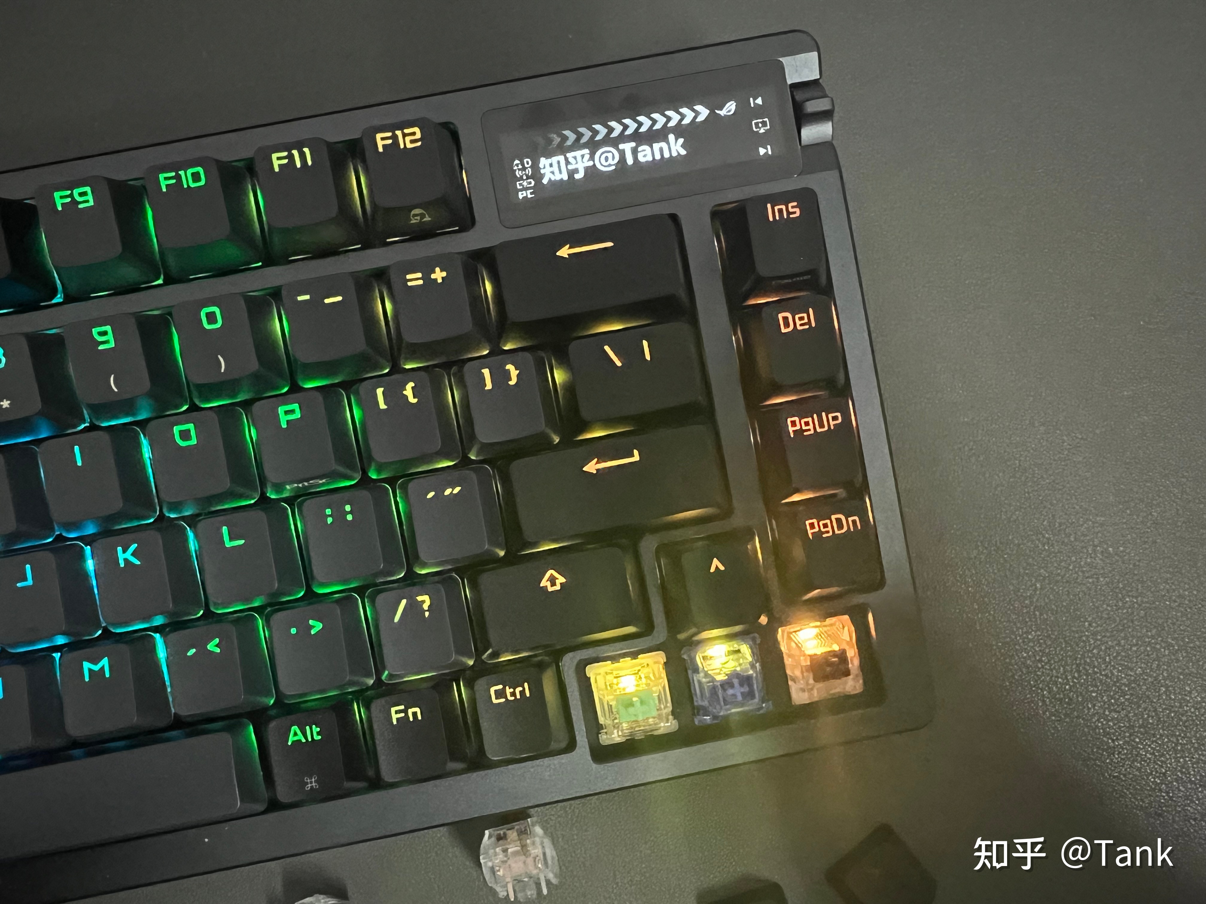 ROG 夜魔是 F 區緊湊的 75% 配列,因爲右側的 OLED 屏幕和三向撥杆的設計所以左側 F 區緊湊, F1 在數字 1 的正上方,像我這種產生肌肉記憶的 dota2 選手用起來就稍微有點難受。