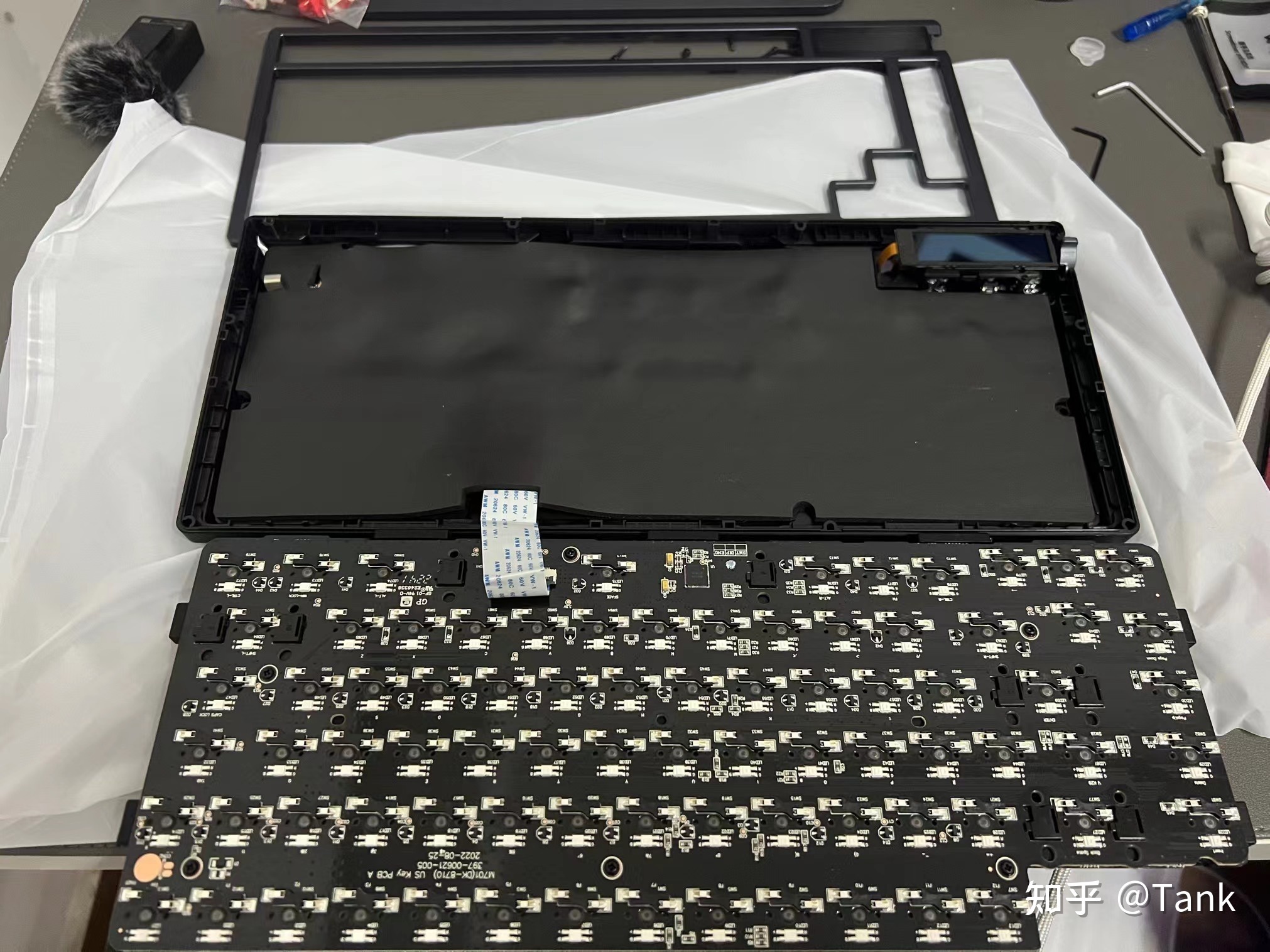 拆開之後拿起金屬上蓋,記得拔掉PCB和主控之間的連線,連線上面蓋着的這層就是 Poron 棉,在 PCB 下方放着在軸體觸發時有一定的消音作用。