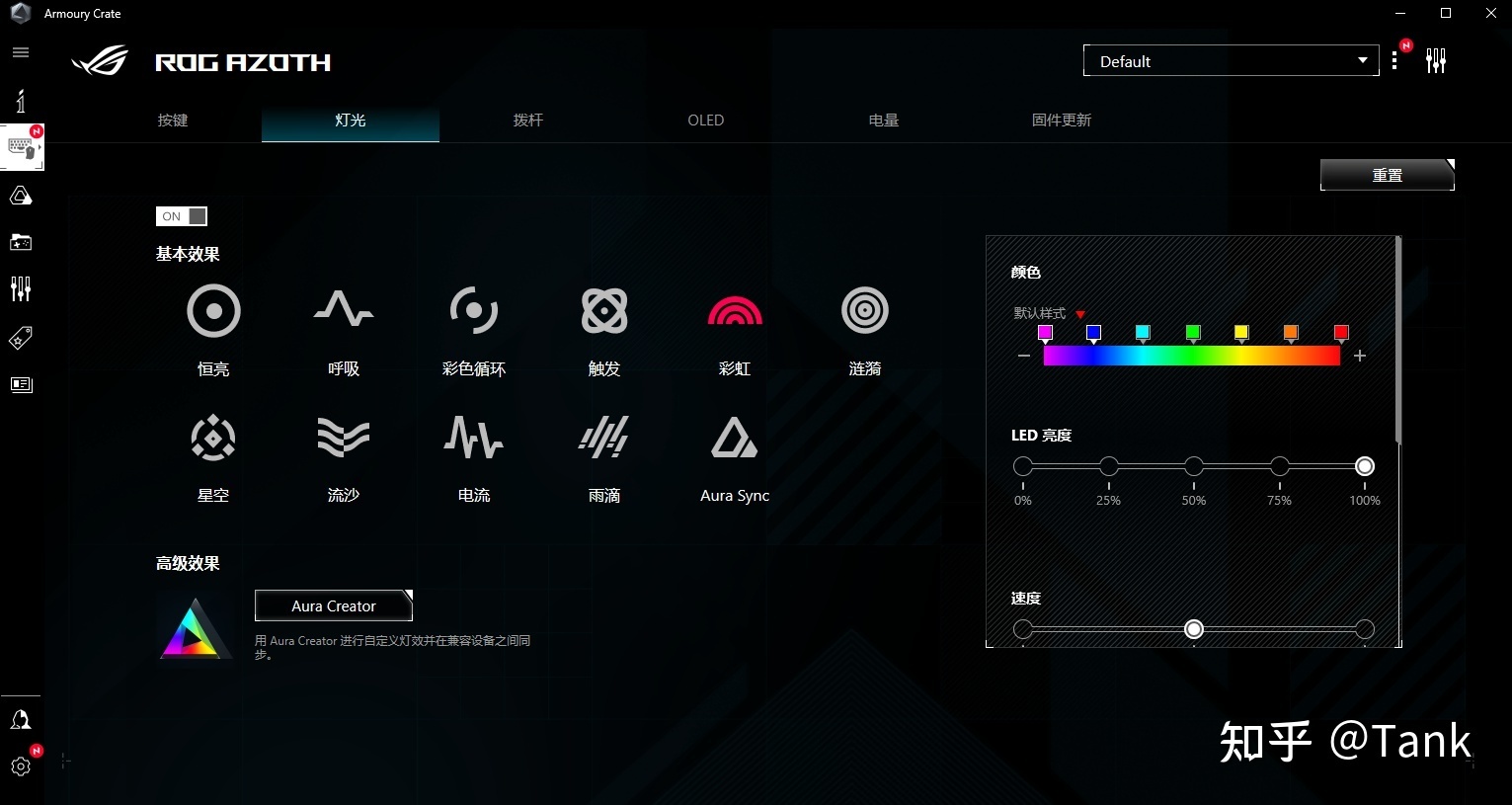 燈光方面出廠默認是 50% 亮度,喜歡的朋友可以和我一樣自己調成100%,這把夜魔同樣也是支持神光同步的,有其他 ROG 產品一起使用效果更好。