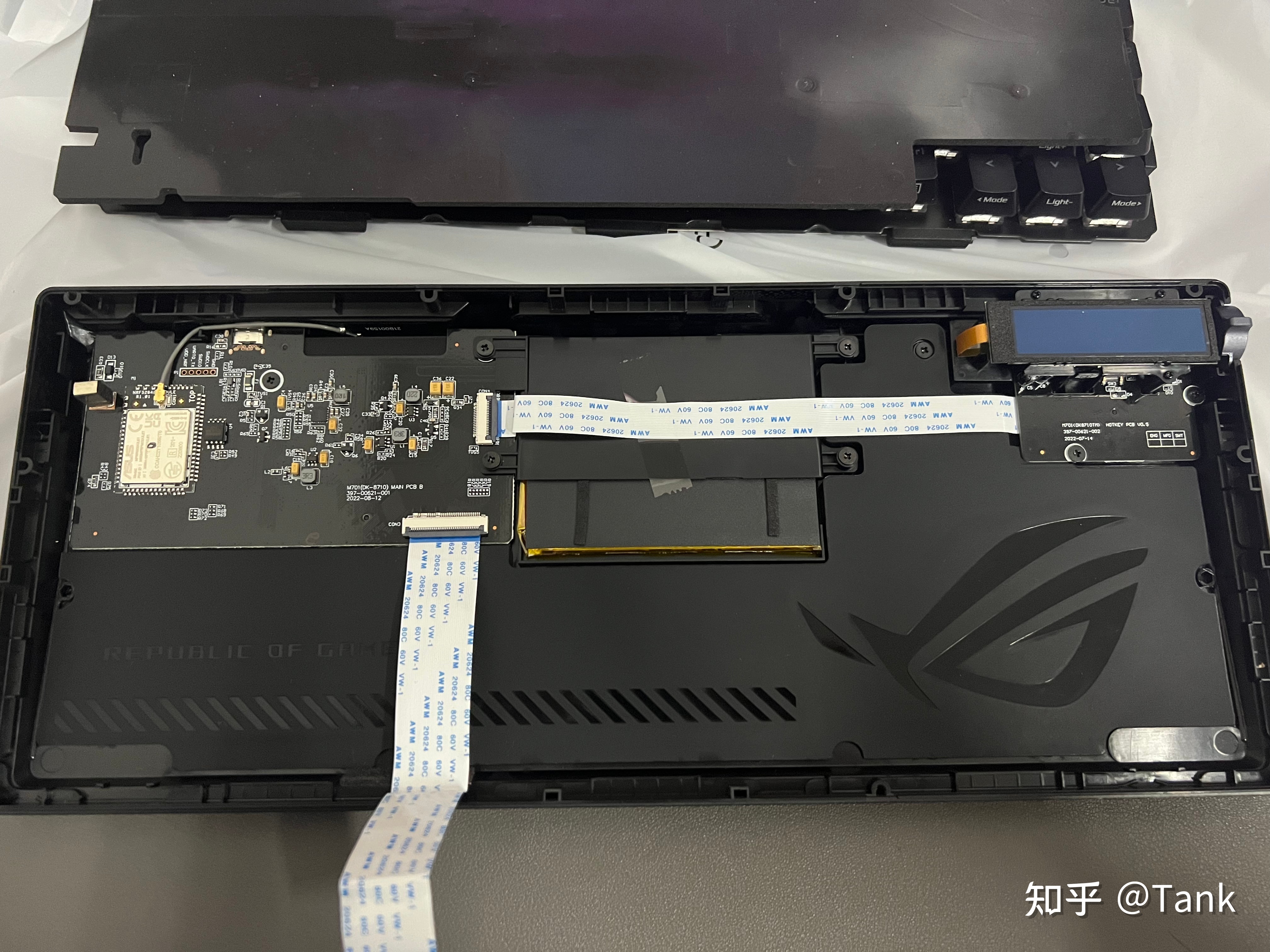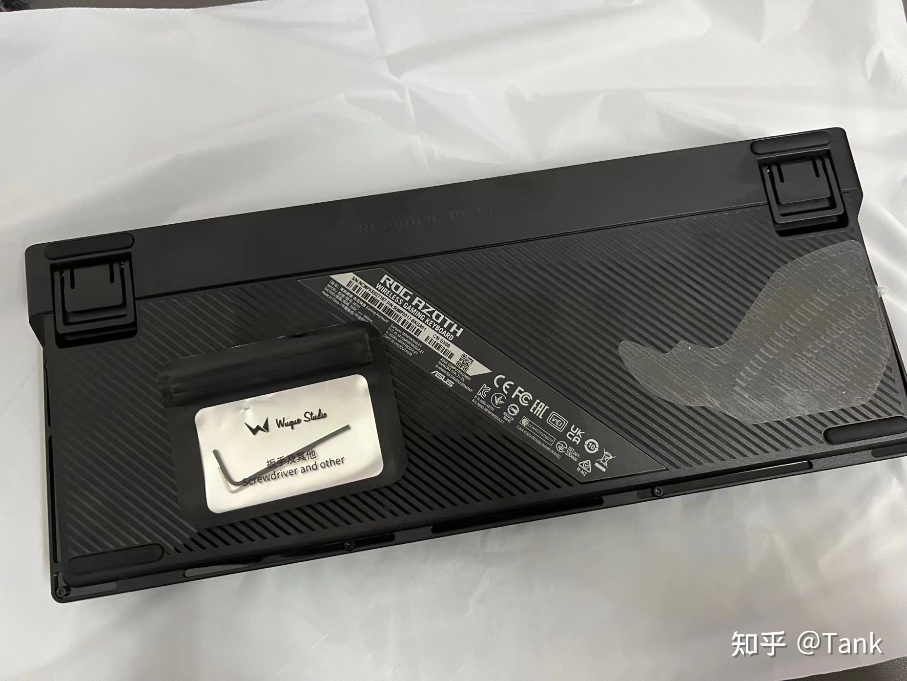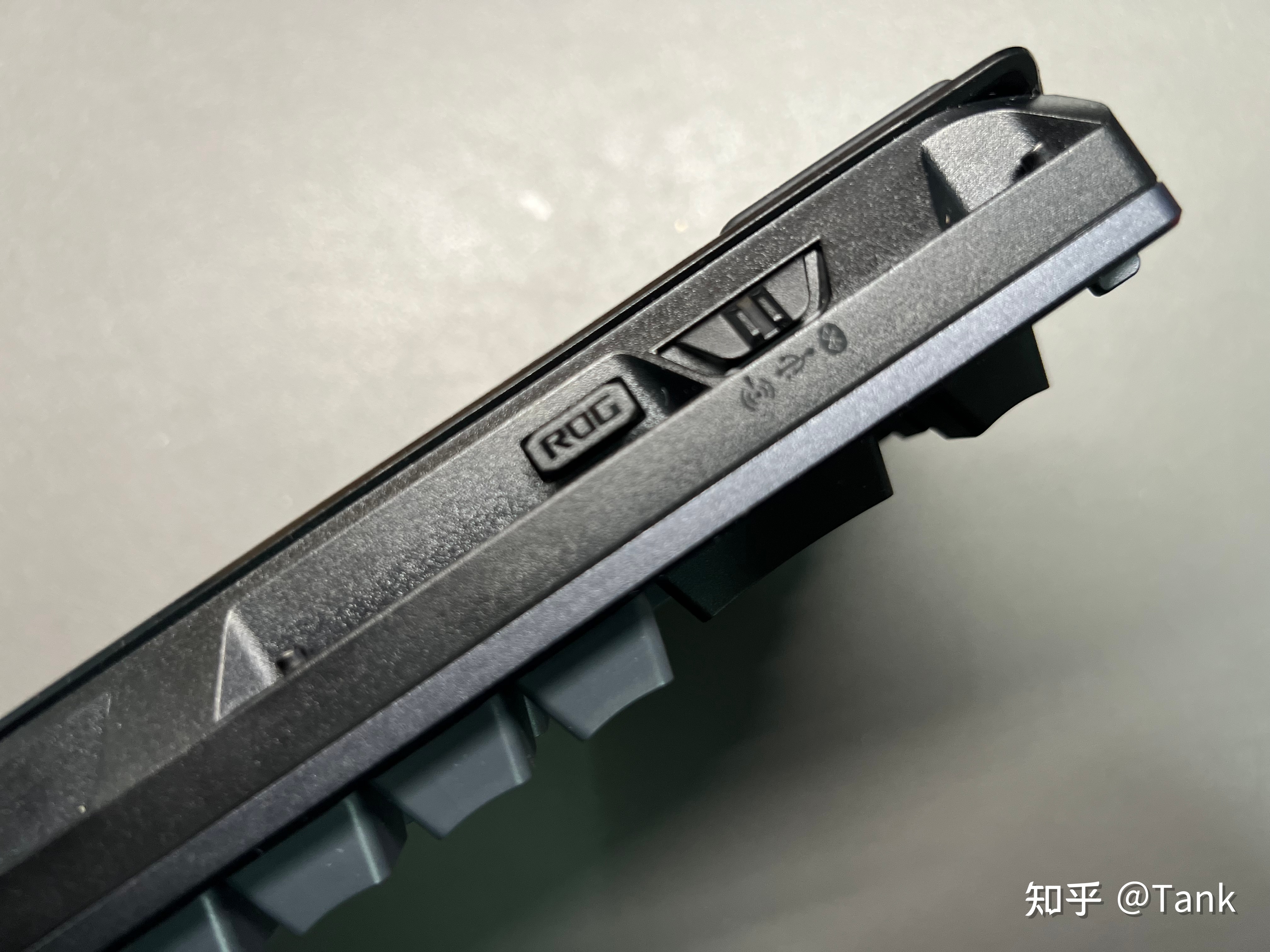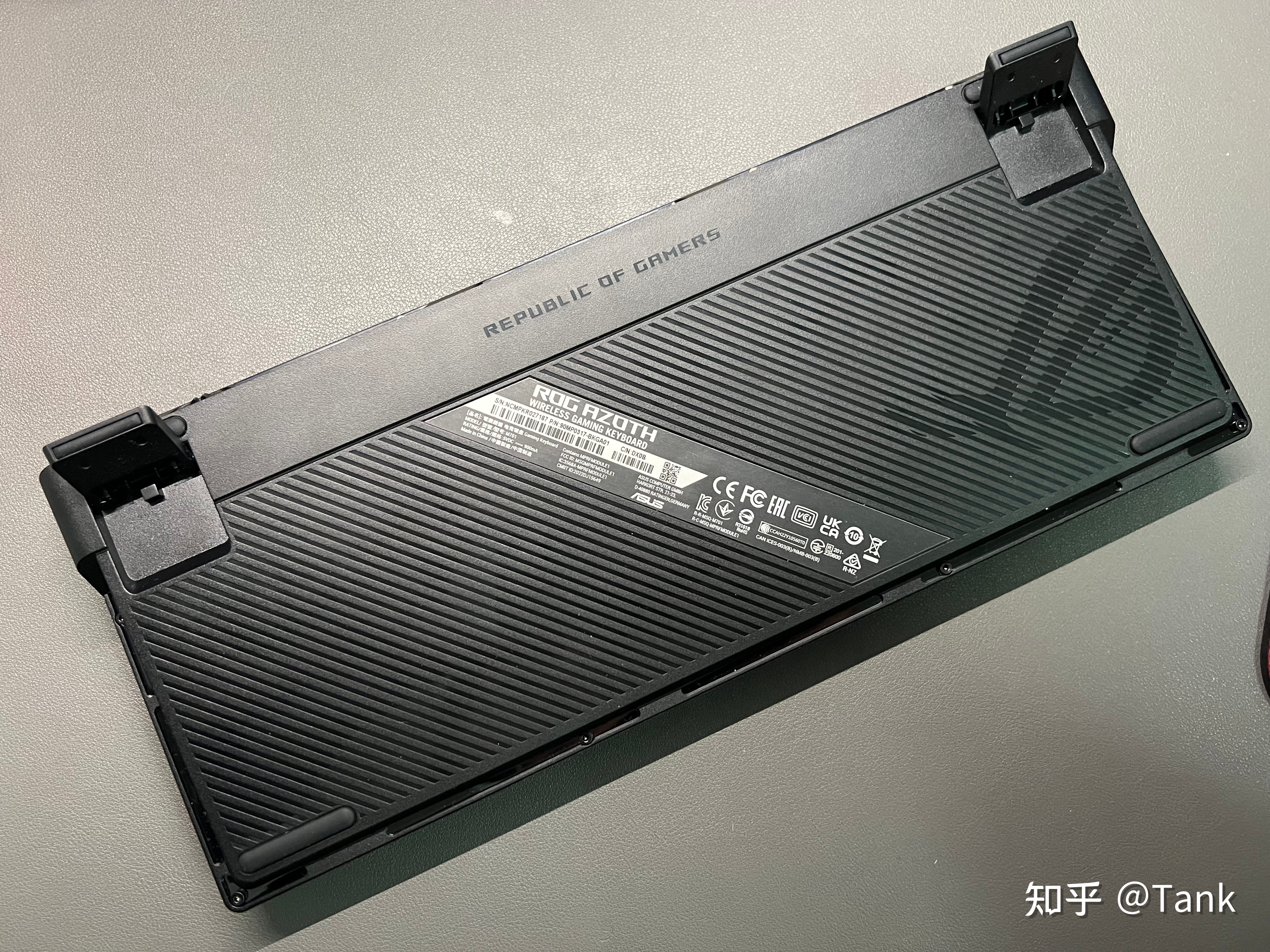 鍵盤背面或者說底殼是塑料的,主要是因爲鋁坨坨做三模肯定新號有所幹擾,ROG 爲了讓步做了上蓋金屬底殼塑料,保證三模信號穩定的同時也可以保留腳撐設計,因爲鋁坨坨沒法做腳撐。