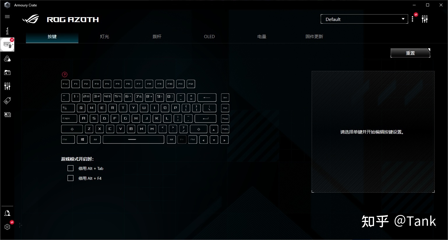 可以通過奧創中心對夜魔的按鍵、燈光、撥杆、OLED屏、電量等方面進行設置,按鍵就是常規的改建,不過 ROG 支持設置 5 種不同的方案,後續無需啓動奧創中心,直接FN+1~5切換設置皆可。