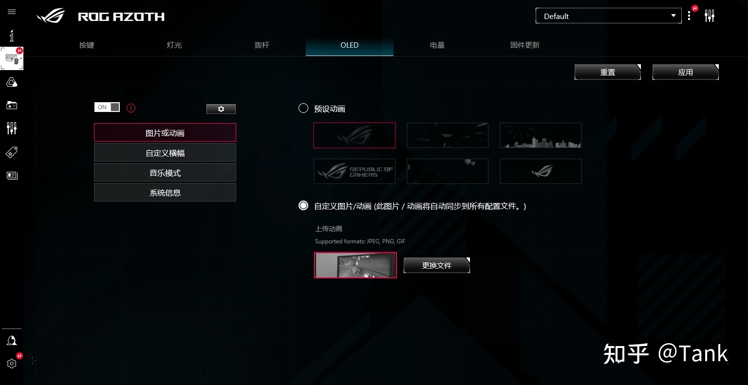 最後要說的就是這款 OLED 屏幕了,可以選擇已有的動畫也可以自行上傳,不過預設動畫不是很多,後續如果能開通玩家互相共享會更好玩。