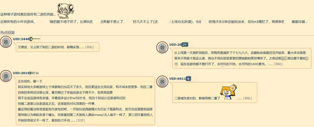 但另一方面这样的做法也解决了很多玩家的痛点,比如有玩家就喜欢二次元渲染的刷宝游戏,也有玩家苦二游抽卡久矣。玩过刷宝网游的玩家没必要被单一画风限制,就像玩二游的也没必要被回合制、开放世界所局限。本质上这是作为第一个吃螃蟹的人,在二游养成定价体系重塑后不可避免的遇到的争议。