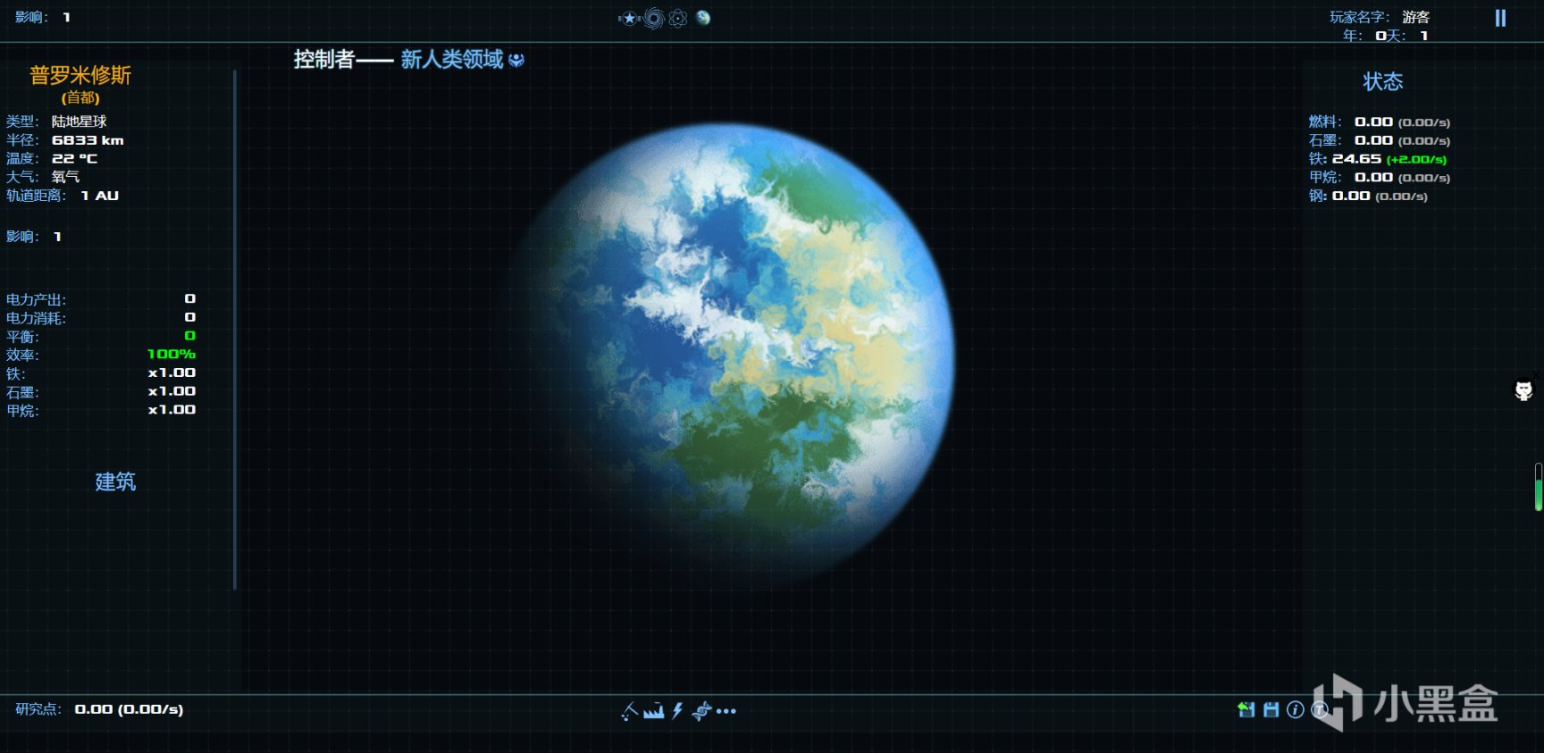 游戏开始,你作为新人类领域势力的控制者,你需要按照系统提示,在普罗米修斯星球上做好早期的资源生产和研究事业,以便向太空迈出更遥远的步伐。
