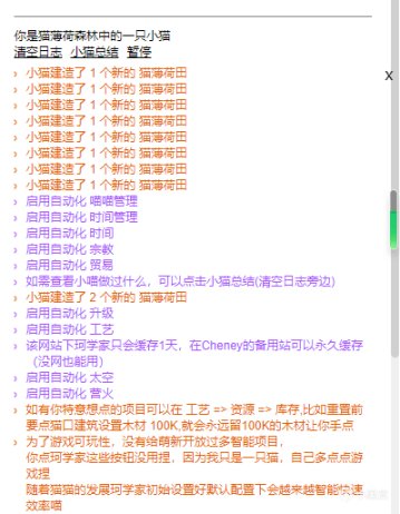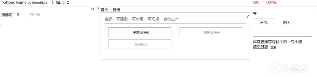 开局是一只小猫,点击采集猫薄荷,建设猫薄荷田来自动生产猫薄荷,精炼猫薄荷得到猫薄荷木,使用猫薄荷木建造小屋,有了小屋就可以扩大猫口……